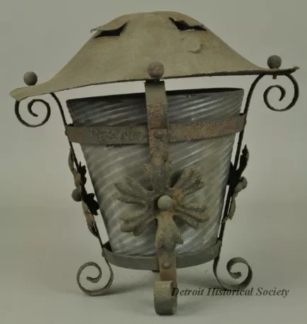 Porch light with metal rosettes on the four brackets. Glass shade has spiral fluting.