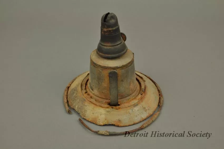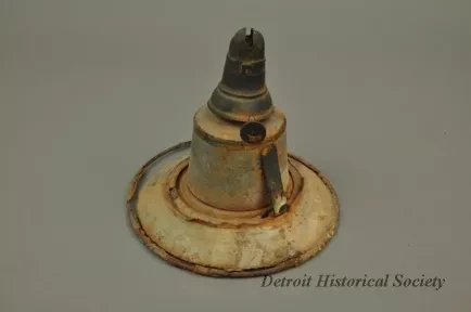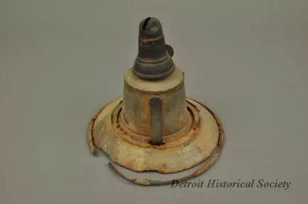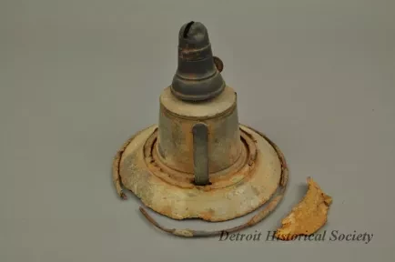 Lamp base: metal with prongs on each side for holding globe; knob on side for controlling wick; lettering on wick knob faded; possibly fits with 2009.20.40; recovered from wreck of the schooner ALVIN CLARK, which foundered in 1864.
