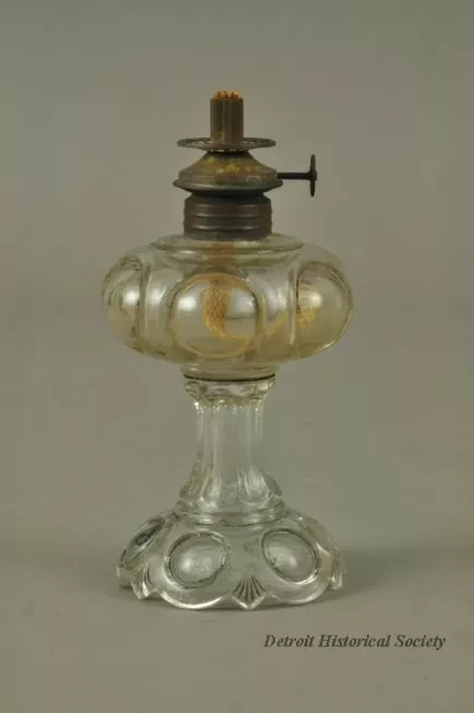 Clear glass kerosene lamp without chimney. Decorated with circular patterns. Together with a pierced metal fitting for the lamp, stored in a plastic bag.