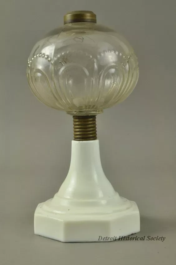 Request ImageKerosene lamp base with a milk glass base and clear glass font with a scalloped row of beading pattern.