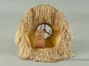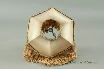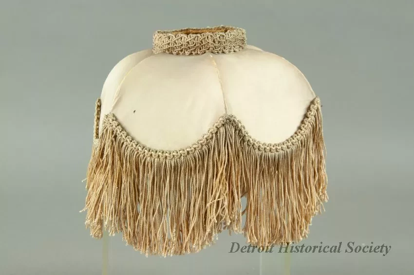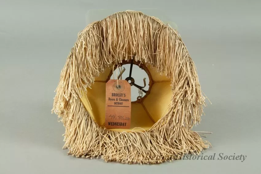 One small ecru-colored lampshade with fringe along the entirety of the edge. There is metal boning for the structure of the lampshade, which is covered in satin. A simple design of knots is at the top of the shade and at the bottom bordering the fringe. The original brown-paper tag is connected to the boning, which reads, "Brossy's Dyers & Cleaners / DETROIT / WEDNESDAY."