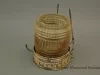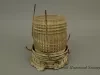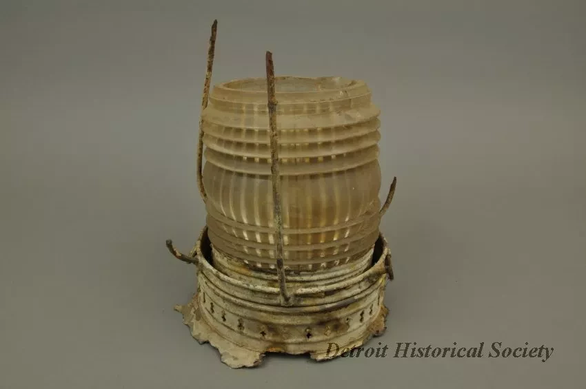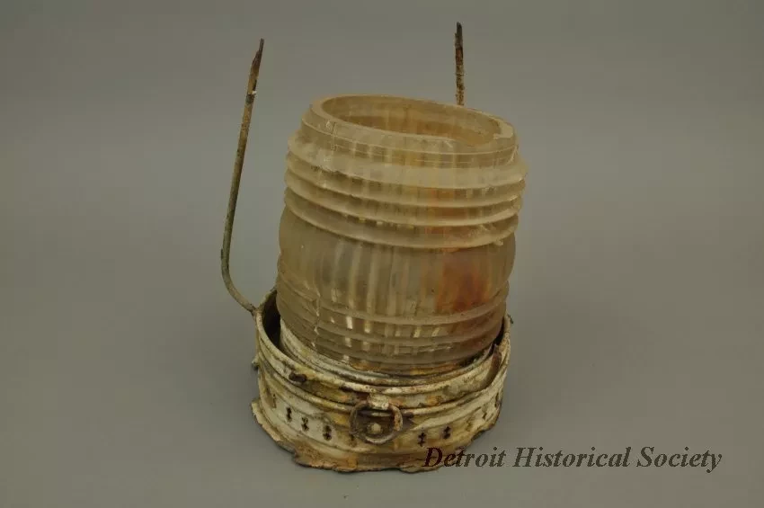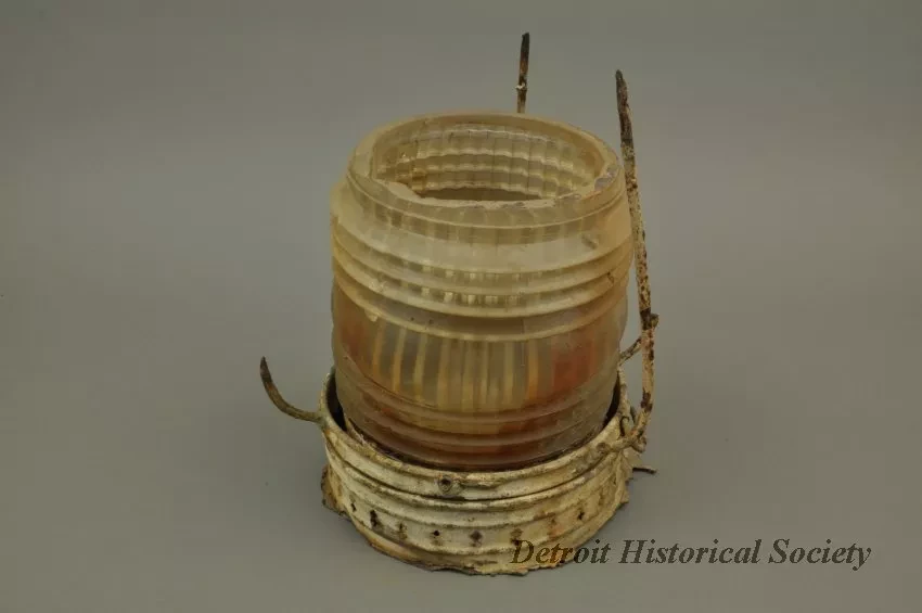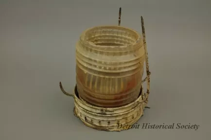 Lantern or lamp: glass and metal; glass ribbed similar to a lens (vertically inside and horizontally on outside); broken wire posts on outside, possibly once part of a cage; metal base with punched-out design; recovered from wreck of the schooner ALVIN CLARK, which foundered in 1864.