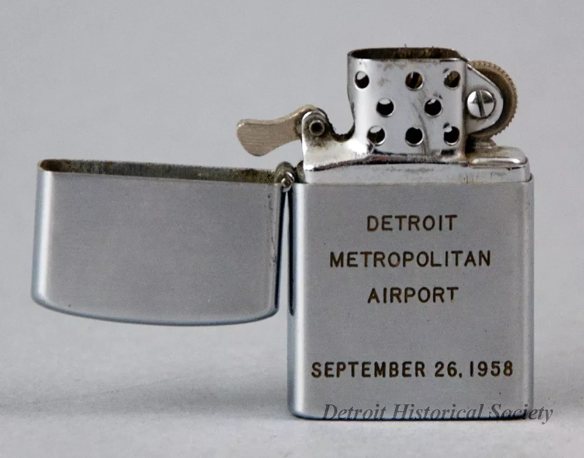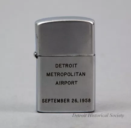 One lighter commemorating the opening of "Detroit Metropolitan Airport, September 26, 1958." The rectangular, pocket-size lighter is made of stainless steel with a brushed finish and has black engraved text on one side to note the airport opening. It has a has a hinged flip top with a spring mechanism, a knurled flint wheel, and a central enclosure for the wick and flame. Stamped text on the bottom reads "Price Associates, Springfield 3, Mass." and "Japan."