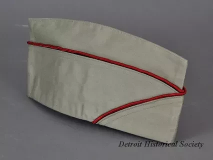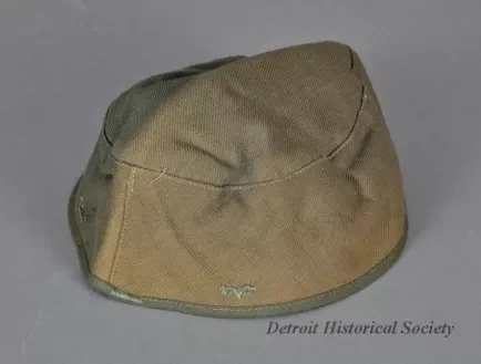 One helmet liner cap worn by U.S. Army Artillery Sgt. Daniel M. Karales. The cap is made of dark green wool and has a light brown flannel lining. The cap has four small buttonholes for attachment to the inside of a helmet. A manufacturer's label on the inside of the liner shows "M-S-A Skullgard Winter Lining, Tab Type - Large Size, For Hats and Caps , Sizes 7 3/8 to 8. Cat. No. DK-16090. U.S. Pat. 2286843, Pat. Can. 1942, Mine Safety Appliances Co., Made in U.S.A., Pittsburgh, PA."