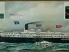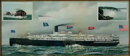 One framed color lithograph print of the sidewheel passenger steamship, SS EASTERN STATES, of the Detroit & Buffalo Steamship Line. The painting shows a port side view of the ship which is underway in fair weather. An inset drawing in the upper left corner of the print shows two giant buffaloes that have steamships strapped to their backs and are charging across the water surface of a lake. A small inset drawing in the upper right corner shows a view of Niagara Falls. The print is held in a decorative gold-colored wood frame with protective glass.
