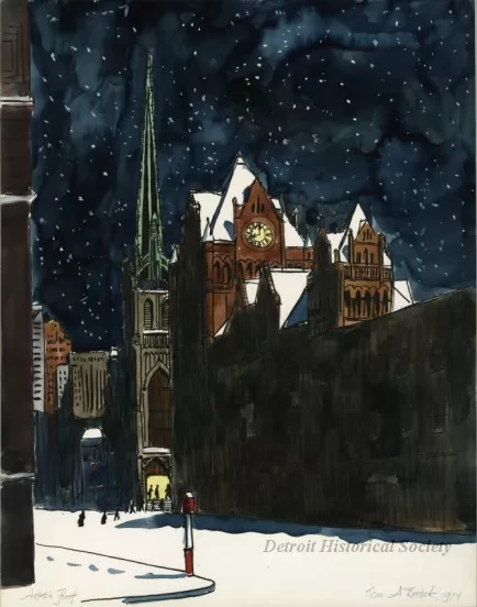 Hand colored artist's proof, mounted on gray board, of a print titled, "Christmas Eve on West Fort Street," by William A. Bostick in 1974. The painting shows the Fort Street Union Depot and the Fort Street Presbyterian Church from Fort Street with a view to the southeast. People are shown walking on the snow-covered street and sidewalk into the church.