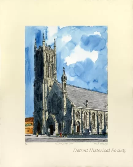 Color lithograph, mounted on board, of a painting of St. John's Episcopal Church by William A. Bostick. It is one of a series of twelve pieces entitled the "The Woods, Bricks, and Stones of Detroit, Vol. I." The piece is numbered 3/50 on the lower left and signed and dated "Wm A. Bostick 1975" on the lower right. The painting shows the southwest corner of the Church at the corner of Woodward Avenue and the East Fisher Freeway. Two people are shown walking along the sidewalk in front of the Church.