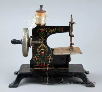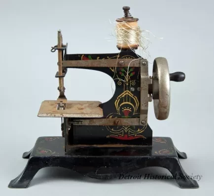 Toy sewing machine: Made of steel and painted black with gold, red and green floral design. Working parts are unpainted. Has black wooden knob on side that turns wheel to operate needle. Lever behind needle moves pressing plate up and down. Pedestal base has four legs. Sole plate is stamped with emblem that depicts an eagle with spread wings and also text that reads "Made in Germany." Needle is missing.