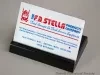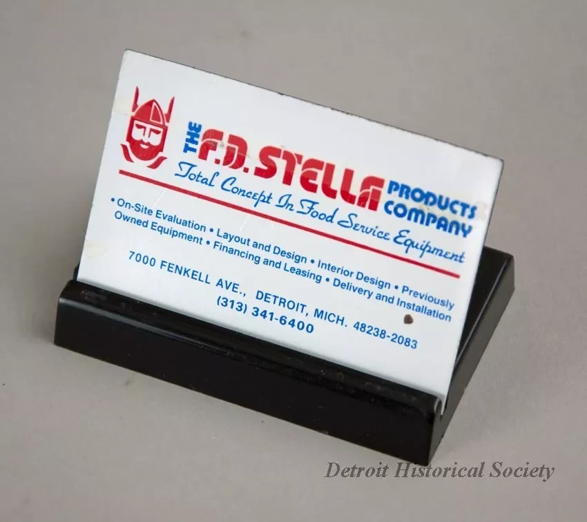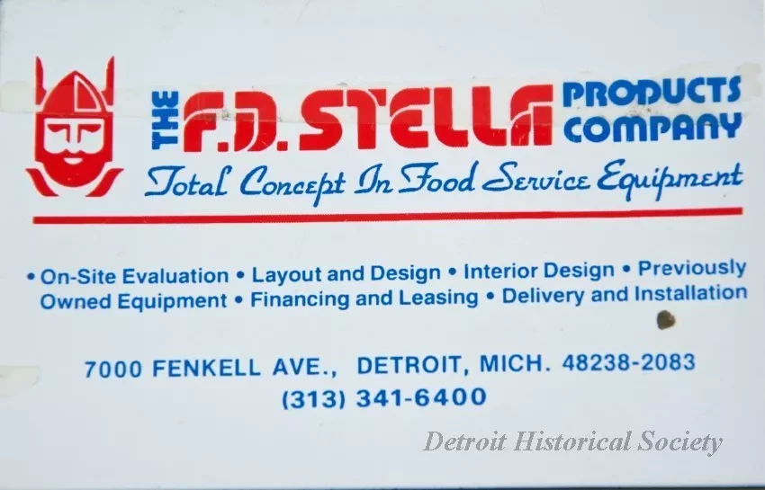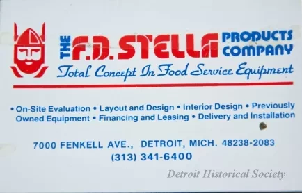 One business card style refrigerator magnet advertising "The F.D. Stella Products Co." The flat rectangular magnet has a white face with red and blue text that reads "The F.D. Stella Products Company - Total Concept In Food Service Equipment." Additional printed text reads "On-Site Evaluation - Layout and Design - Interior Design - Previously Owned Equipment - Financing and Leasing - Delivery and Installation," and "7000 Fenkell Ave., Detroit, Mich. 48238-2083. (313) 341-6400." A red image of the head of a Viking man is printed in the upper left corner of the card.