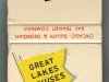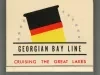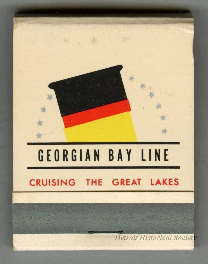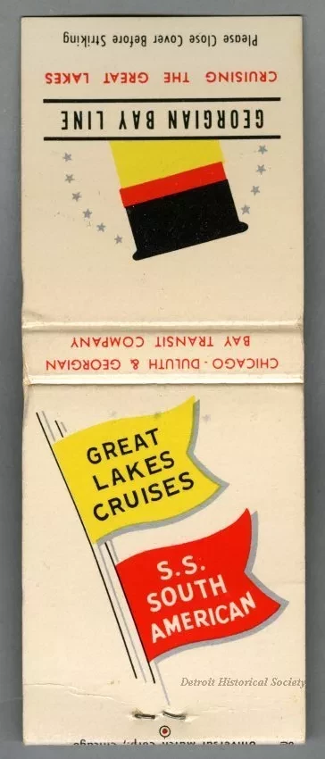 One matchbook advertising the "Georgian Bay Line." The matchbook has a white cover with a red/black/yellow smokestack emblem on the front along with black and red text that reads "Georgian Bay Line, Cruising the Great Lakes." The back cover shows a red/black/yellow image of two flags with text that reads "Great Lakes Cruises" and "S.S. South American." The inside cover shows a map of cruise destinations and company office locations with addresses. The matchbook was made by "Universal Match Corp., Chicago."