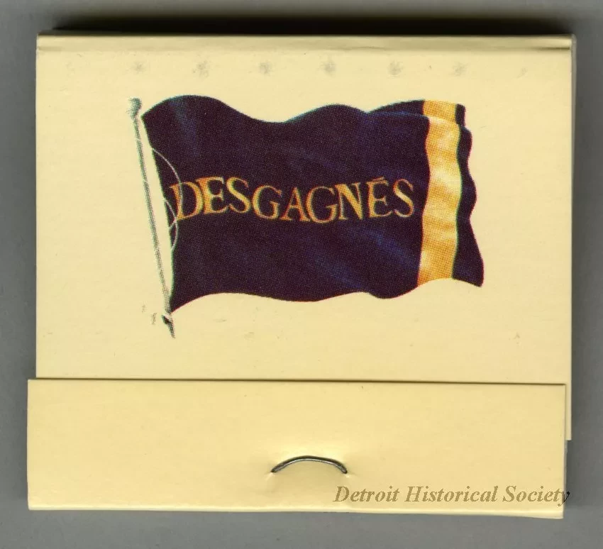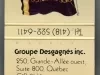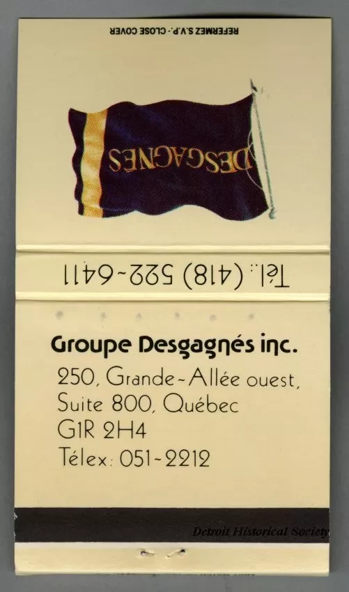 One matchbook advertising the merchant marine manager, "Groupe Desgagnés, Inc.," of Quebec. The matchbook has a pale yellow cover with a dark blue and yellow image of the company flag on the front. The back cover shows the company name and address, "Groupe Desgagnés, Inc., 250 Grande-Allée ouest, Suite 800, Quebec G1R 2H4" and "Télex 051-2212." The inside cover is blank. The matchbook was made by "Eddy Match Co., Ltd., Montreal, P.Q."
