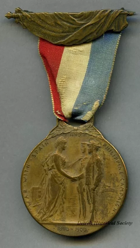 1 - Commemorative medal worn by United Spanish War Veteran, Joseph Hoffman. The medal has an irregular-shaped brass top that depicts a draped American flag. A red, white, and blue vertically-striped ribbon hangs beneath along with a circular brass medal. The medal shows an image Lady Columbia shaking hands with a soldier and a sailor. Raised text along the perimeter: "War With Spain and Philippine Campaign 1898-1900", the name of the designer, "V.D. Brenner," is engraved in small text at the lower right corner of the image. The reverse side of the medal has raised text along the perimeter that shows "The People of the State of Michigan To" with the name, "Joseph B. Hoffman," engraved at the center. A decorative laurel wreath design is shown in the background. The medal is contained in a small rectangular blue box that has two printed labels on the end. One label shows "Consolidated Jewelers Mfg. Corp." and the other shows "28878, Philippine Island Campaign" along with other text.
