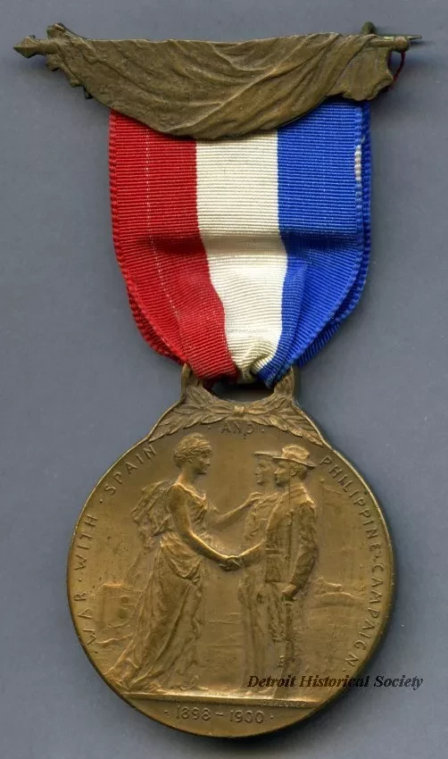 One commemorative medal worn by Spanish-American War veterans. The medal has an irregular-shaped brass top that depicts a draped American flag. A red, white, and blue vertically-striped ribbon hangs beneath along with a circular brass medal. The medal shows an image Lady Columbia shaking hands with a soldier and a sailor. Raised text along the perimeter: "War With Spain and Philippine Campaign, 1898-1900." The name of the designer, "V.D. Brenner," is engraved in small text at the lower right corner of the image. The reverse side of the medal has raised text along the perimeter that shows "The People of the State of Michigan To" with no name engraved at the center. A decorative laurel wreath design is shown in the background.
