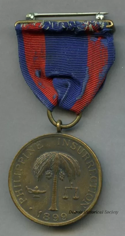One commemorative medal worn by Spanish-American War veteran, Joseph Hoffman. The medal has a red and blue vertically-striped ribbon at the top with a hanging circular brass medal. The medal shows a palm tree at the center with a lamp and balance scale in the background. Obverse: raised text along the perimeter: "Philippine Insurrection 1899", reverse side of the medal shows an image of an eagle standing over crossed rifles and flags as well as raised text: "United States of America For Service." Thirteen stars are shown along the lower border.