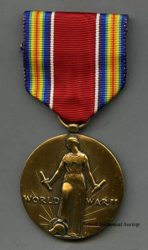 One World War II commemorative medal awarded to Capt. Morgan L. Howell. The medal has a red, white, blue, orange, and yellow vertically-striped ribbon at the top with a hanging circular brass medal. The medal shows a Lady Columbia figure at the center who is holding one section of a broken sword in each hand. Raised text shows "World War II." The reverse side of the medal shows raised text at the center that reads "Freedom From Fear and Want" and "Freedom of Speech and Religion." Raised text along the perimeter shows "United States of America, 1941-1945."