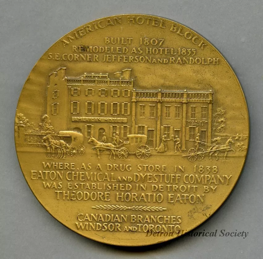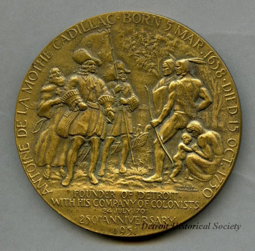 One commemorative medal from the Detroit 250th Anniversary celebration in 1951. The circular bronze medal has a relief image on the obverse that depicts the landing of Cadillac and the founding of Detroit. Text along the image perimeter reads "Antoine de la Mothe Cadillac, Born 5 Mar. 1658 - Died 15 Oct. 1730." Additional text at the base of the image reads "Founder of Detroit With His Company of Colonists, 24 July 1701. 250th Anniversary, 1951." The sculptor's name, "Rene P. Chambellan," is shown in small text at the lower right side of the image. The reverse depicts an early Detroit street scene with a hotel, commercial buildings, and horse-drawn carriages. Accompanying text reads "American Hotel Block, Built 1807. Remodeled as Hotel, 1835, S.E. Corner Jefferson and Randolph" and "Where, As a Drug Store in 1838, Eaton Chemical and Dysestuff Company was Established in Detroit by Theodore Horatio Eaton. Canadian Branches, Windsor and Toronto." Stamped text on the edge of the medal reads "Medallic Art Co., N.Y. Bronze."