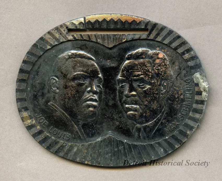 One commemorative medal to celebrate the boxing matches between Joe Louis and Max Schmeling in 1936 and 1938. The medal is made of an oval-shaped sheet of zinc that has been stamped with images of the heads of the two boxers. Small raised text shows the name beneath each image. The images appear to depict older, middle-aged men so the medal may have commemorated a 40th anniversary of the first match. The medal has a decorative border, a brass-colored finish, and a narrow slot at the top for a 1-inch wide ribbon. No manufacturer's name or marks are visible.