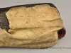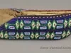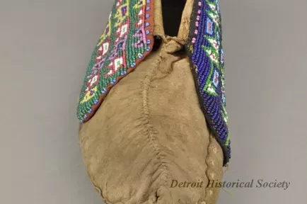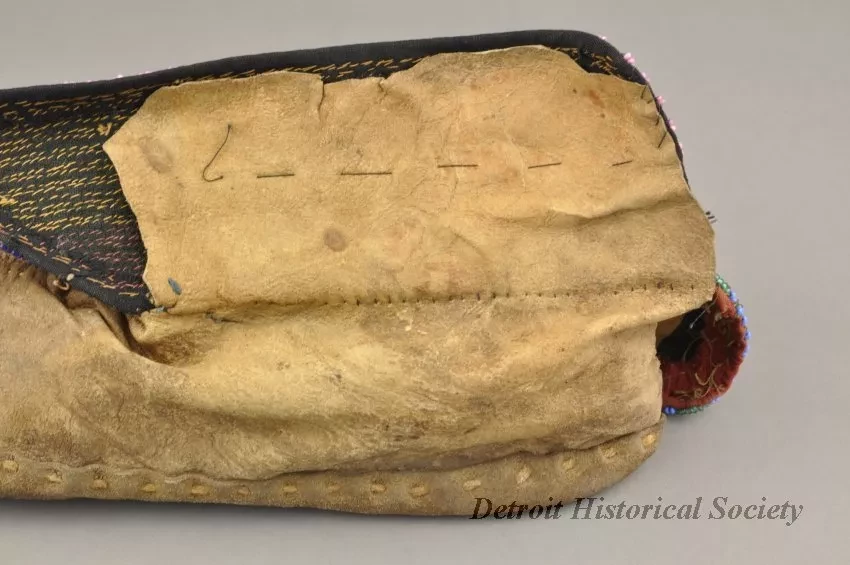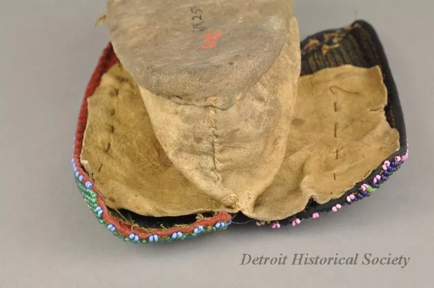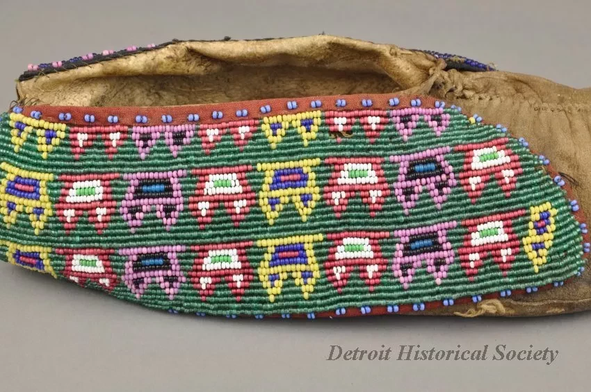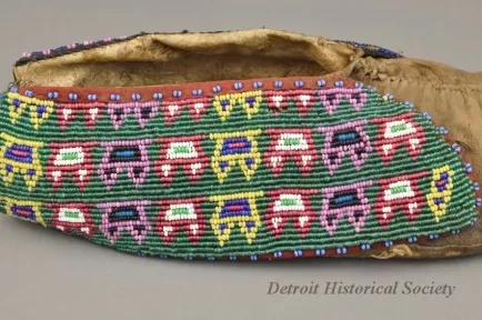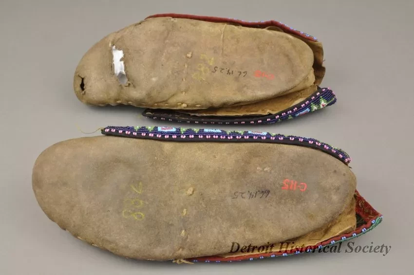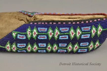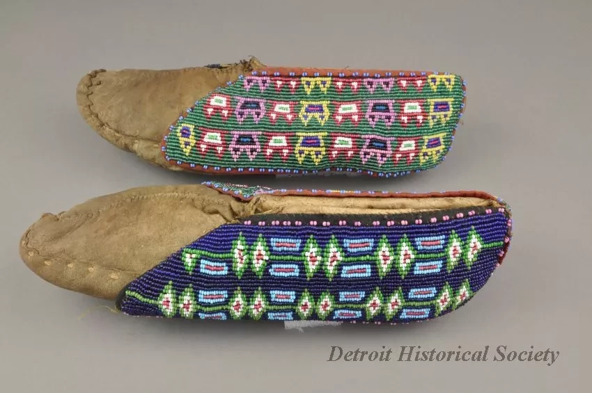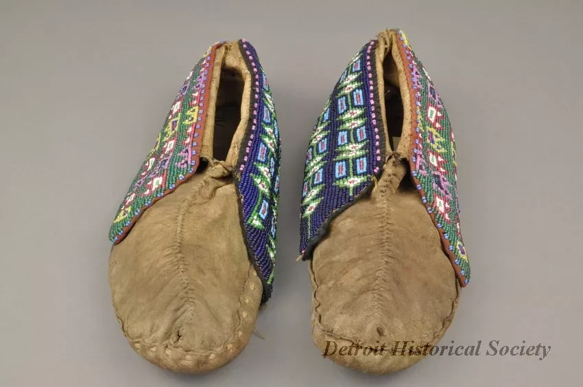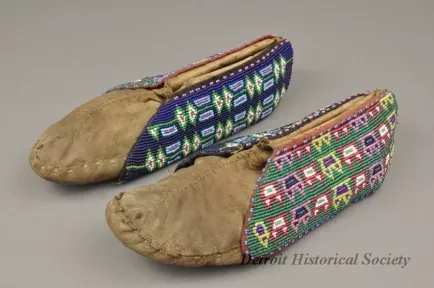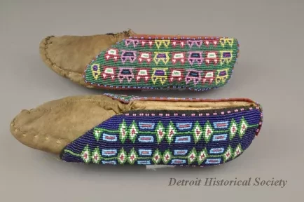 1 - Pair of Moccasins: Fox tribe, Tama, Iowa. Made of natural buckskin with beaded flaps. Hand sewn seam from toe up instep. Beadwork shows geometric design, inner flap has geometric design in light blue, red, green and white beads on a dark blue background. Outside flap has a geometric design in dark blue, light blue, red, green, white, pink, black and yellow beads on green beaded background.