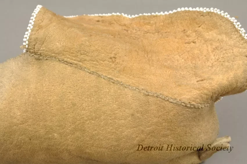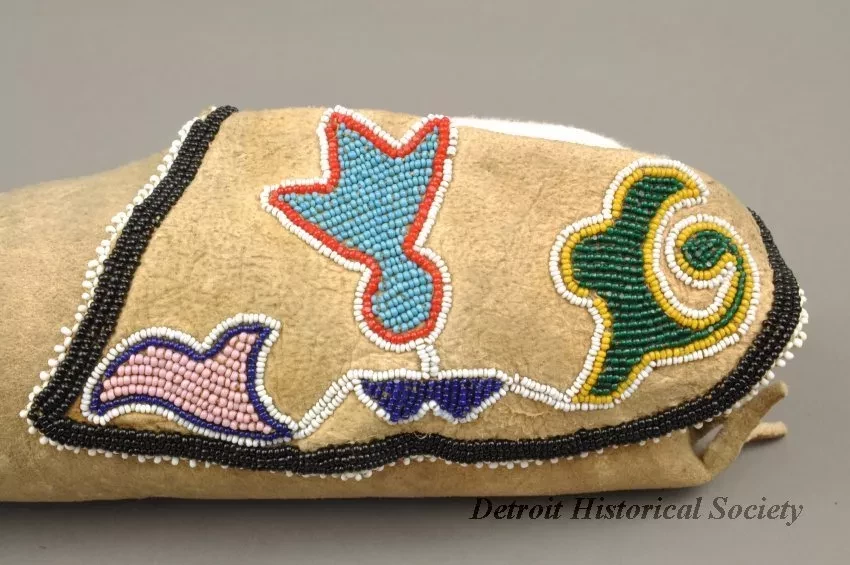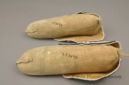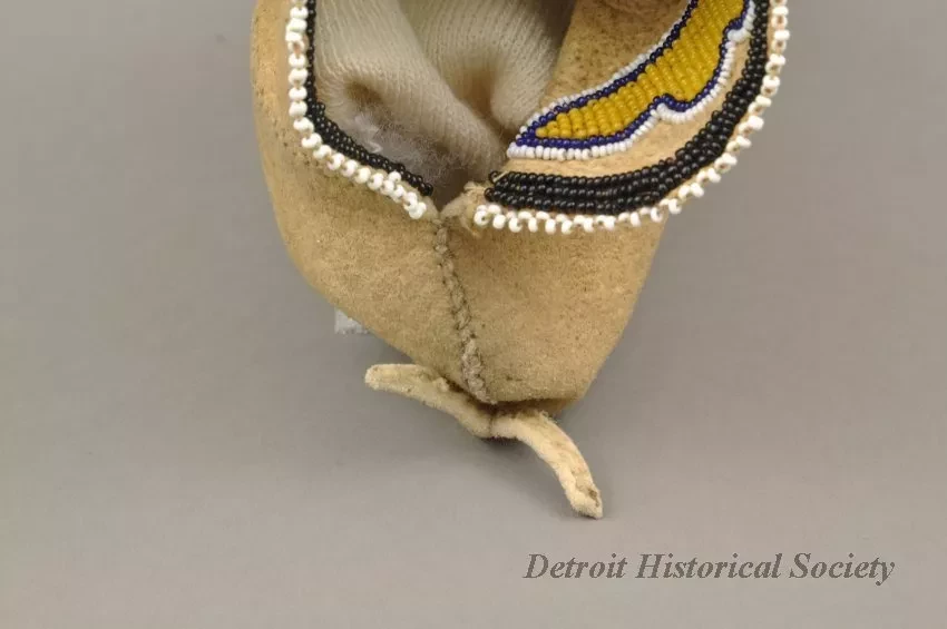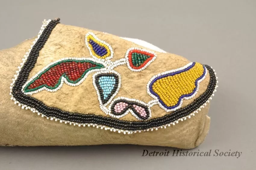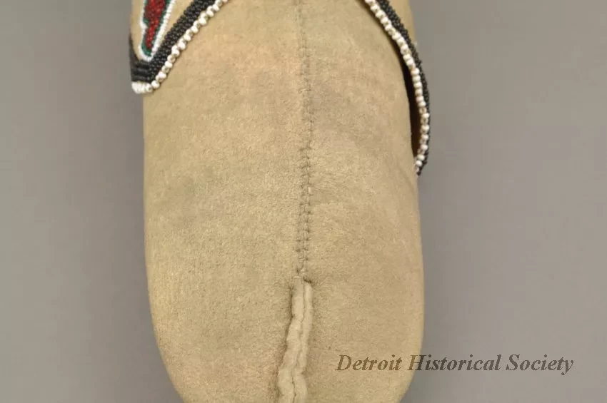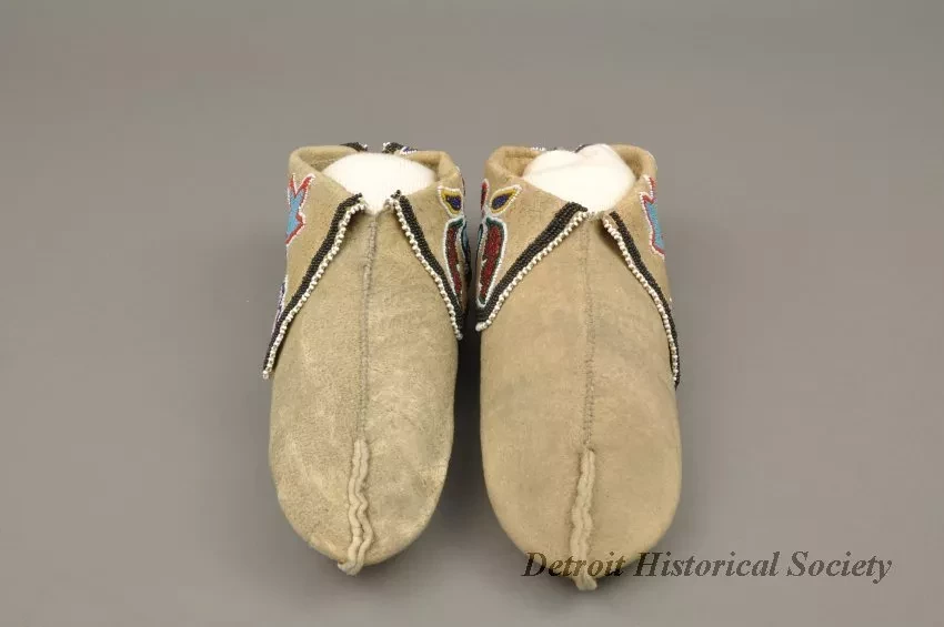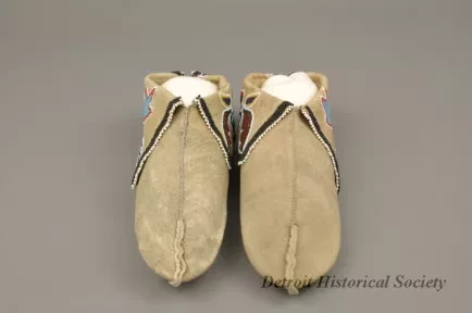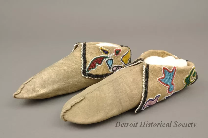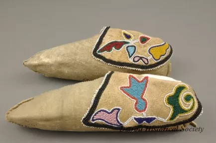 1 - Pair of Moccasins: Winnebago tribe, Wisconsin. Buckskin, with beaded flaps. Hand-sewn seam from toe up instep. Flaps beaded with black, light and dark blue, white, yellow, pink, red and green beads on buckskin background in floral design.