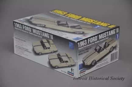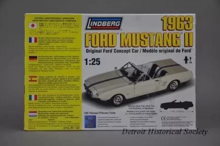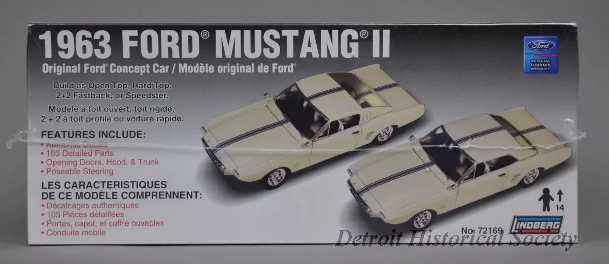 One 1/25 scale model of a "1963 Mustang II" automobile. The unopened kit no. 72169 is contained in a cardboard box that has multicolor images and text printed on the exterior. The box shows photographs of the completed 7.25-inch long plastic model as well as close-up photos of various styling details. The kit was manufactured by "J. Lloyd International, Inc.," under the "Lindberg" trademark.