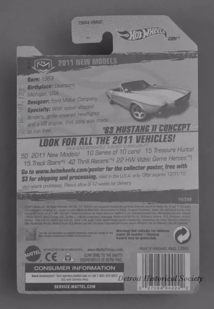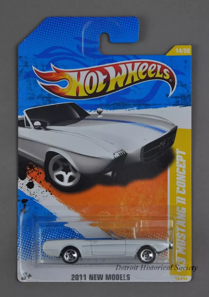 One "Hot Wheels" toy car which depicts the 1963 Mustang II Concept automobile. The metal and plastic toy is displayed in an unopened clear plastic container that is glued to a cardboard card. The card has a multicolor image of the car on the front with gray and black printed text on the verso. It was manufactured by "Mattel, Inc."
