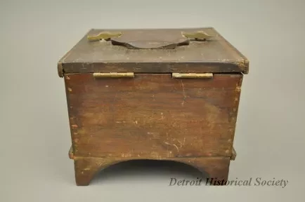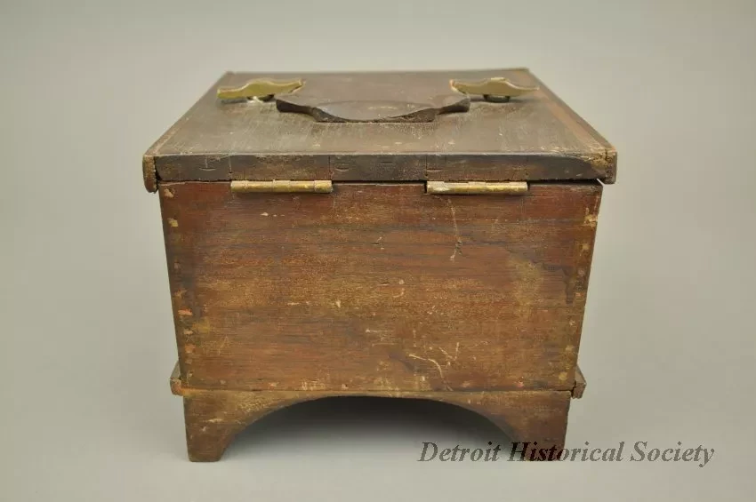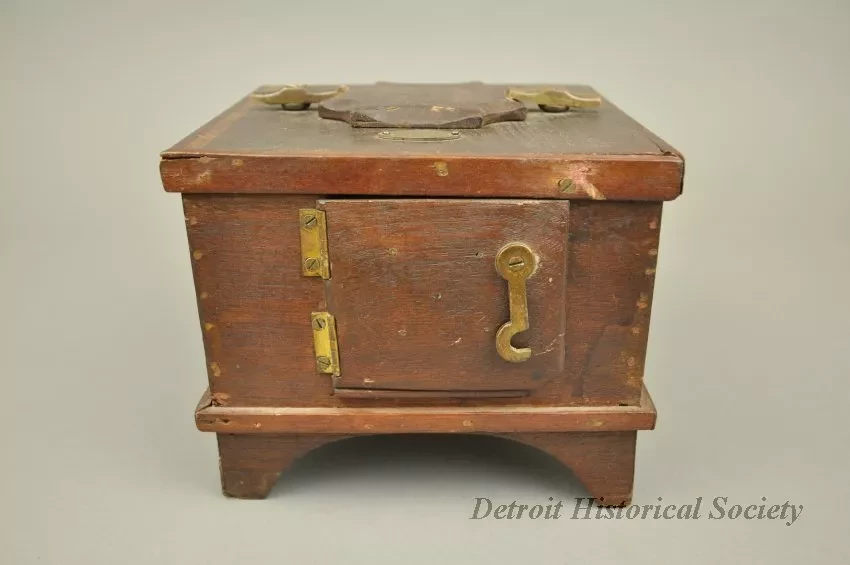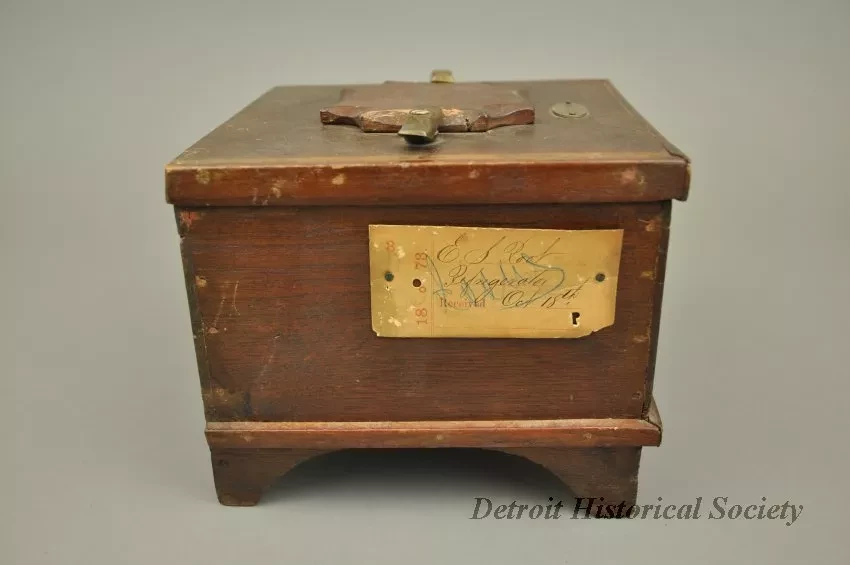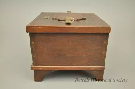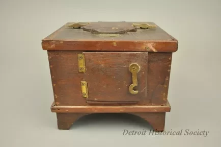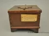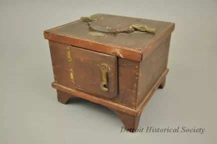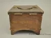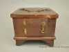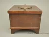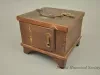 Patent Model ,Refrigerator, E. S. Root, Providence, RI. December 2, 1873. Wooden box with legs, metal compartments inside for ice and/or water. Access door on top and in front.
