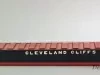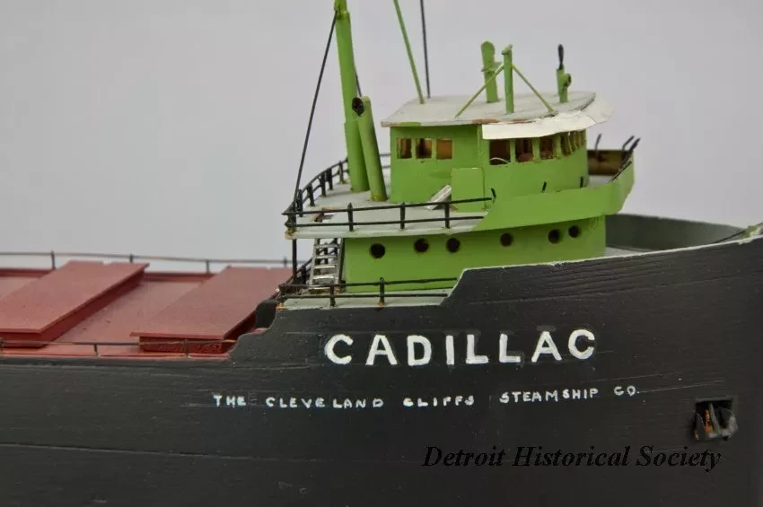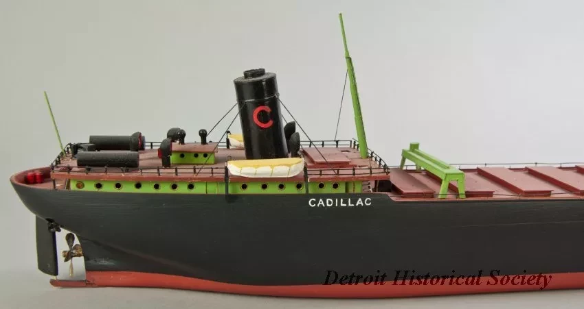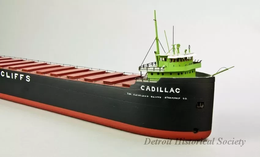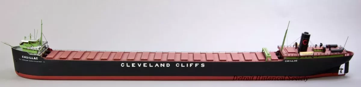 One ship model of the steamship, CADILLAC, which was a bulk carrier of the Cleveland Cliffs Steamship Company. The model has a single propeller, a bow thruster, and a smokestack with a red "C" painted on the sides. The model also has a red deck, light green trim on the pilothouse and cabin structures, and a black hull. The name, CADILLAC, is painted in white lettering on the sides at the bow and transom and the company name, "Cleveland Cliffs," is painted in large white lettering on the sides of the hull near the center of the ship model.