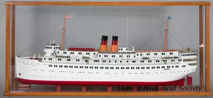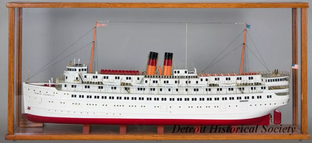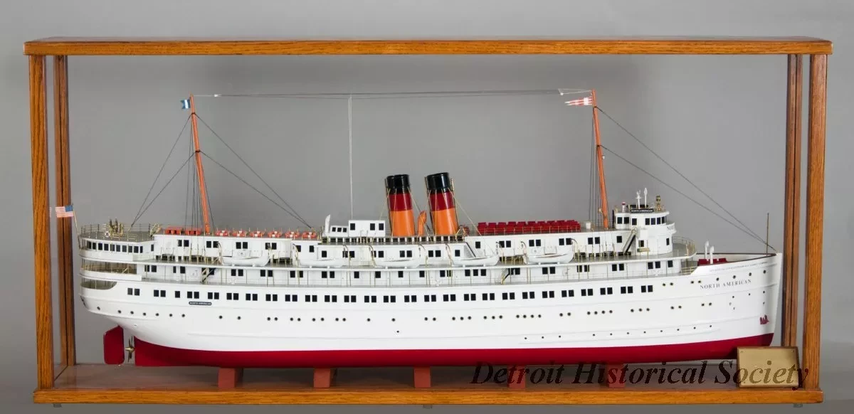 One model of the passenger steamship, SS NORTH AMERICAN, of the Chicago, Duluth & Georgian Bay Transit Company. The model (scale: 1/8" = 1') is made primarily of wood with fittings made of metal, plastic, paper, and thread. The hull and cabin structures are painted white with gray for the decks. Metal railings along the sides of the decks are gold-colored. The underside of the hull is painted red. The ship name is painted in black letters on each side of the hull at the bow. Also, nameboards are shown on each side of the bridge, each side of the hull at the quarter, and on the transom. The model is mounted on a rectangular oak wood base that has been finished with a light brown stain and a semi-gloss lacquer. Narrow columns of matching wood are located at each corner to provide a framework for protective plexiglass panels on the four sides. A matching wood panel is attached to the top with wood a single wood screw at each corner column. A small brass plate is mounted on the base near the bow and has engraved text that reads "North American, 259 x 47 x 18, 1913-1967."