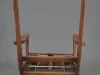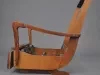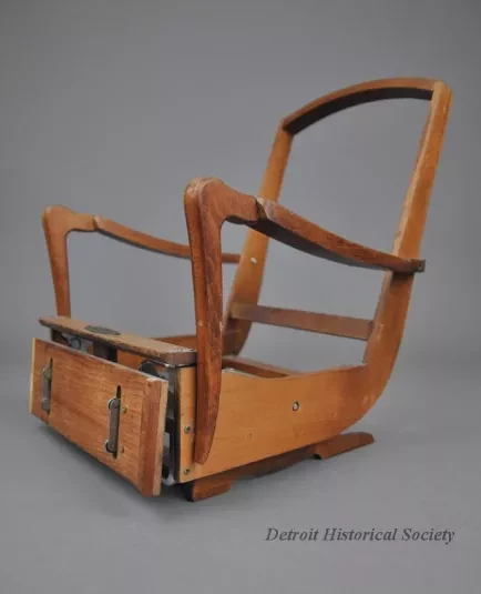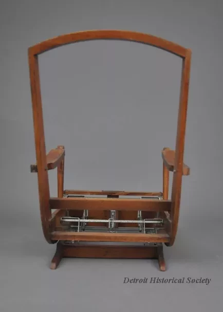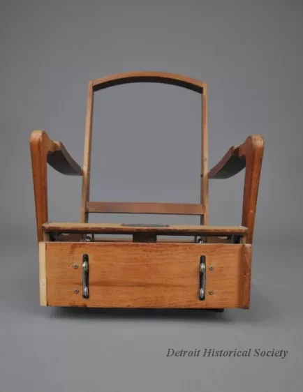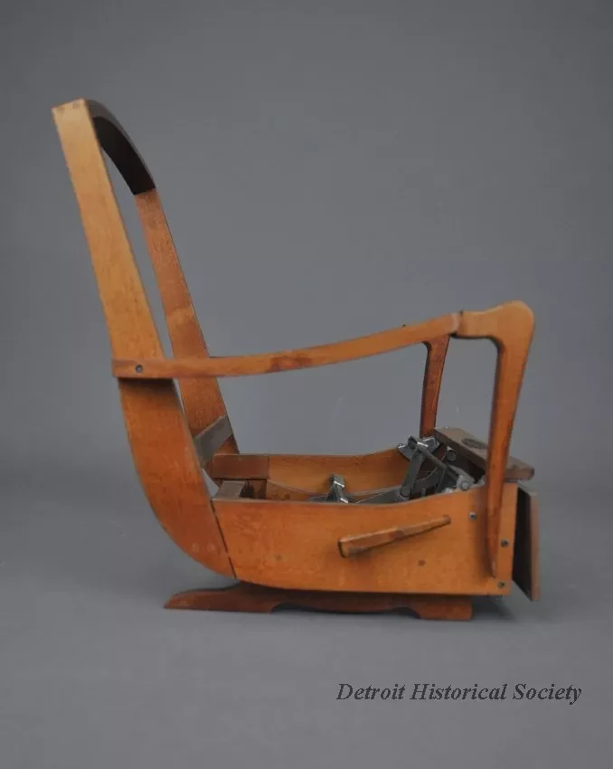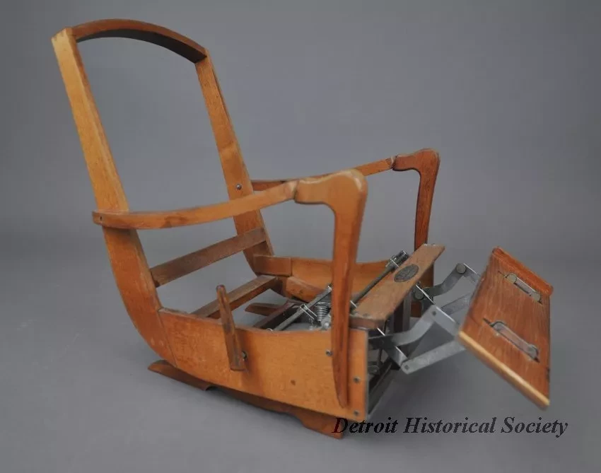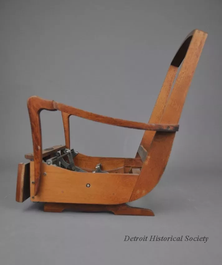 One product model of the La-Z-Boy reclining lounge chair. The chair framework is made of fine-grained wood that has been assembled with small nails and screws. The wood has been stained medium brown and finished with a light lacquer. No upholstery is included on the model in order to display the functional internal rocking and reclining mechanisms which are made of chrome-plated steel. An oval-shaped brass plate on the top front of the model has raised text that shows "Patented La-Z-Rocker, Product of La-Z-Boy Chair Co., Monroe, Mich."