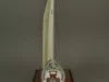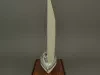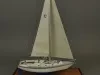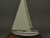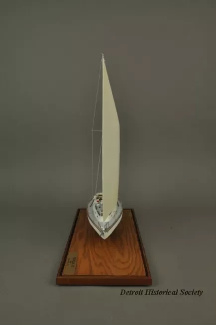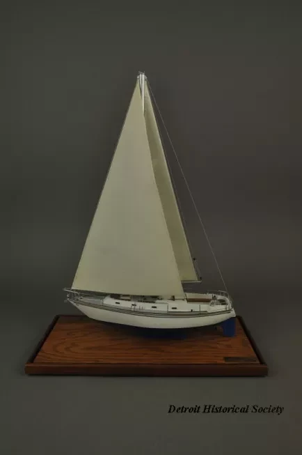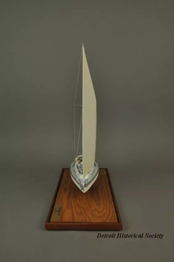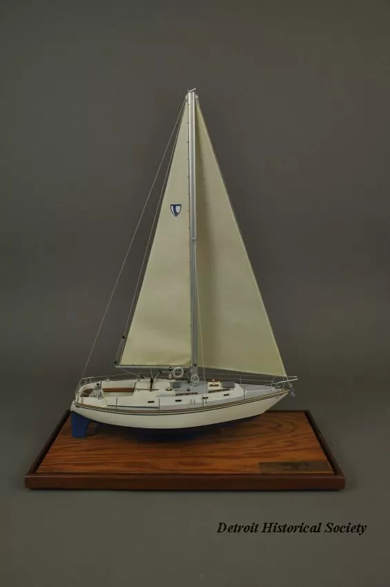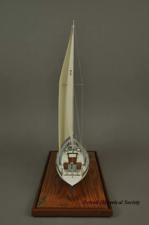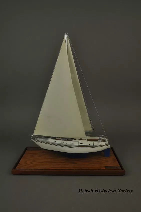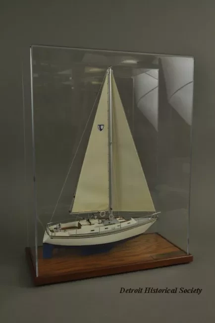 One model of a Tartan 37 sailboat. The model depicts a typical 37-foot long sloop rig recreational sailboat with a fin keel and an inboard auxiliary engine. It has an aluminum mast with single spreaders and stays, a mainsail, roller-furling jib, bow and stern pulpits with double lifelines, a raised cabin top with four portholes on each side, teak handrails and toe rails, and a large aft cockpit with teak seats. The model is made primarily of wood with fittings made of metal, plastic, paper, and thread. The deck and topsides are painted white with light blue/gray for the anti-skid areas of the deck. The water line stripe is painted dark blue and the underside of the hull is painted blue. A stylized "T" (the manufacturer's logo) is shown on the mainsail. The model is mounted on a rectangular wood base that is made of oak with mahogany trim strips along the edges. The wood base has been finished with a light brown stain and a semi-gloss lacquer. A small brass plate is mounted at one corner of the base and shows "Model By H. Nissley, Riverview, Mich." A second small brass plate is mounted at the opposite corner of the base and shows "Tartan - 37, 1985, Scale 3/8 In. - 1 Ft." The model includes a fitted clear acrylic protective cover.