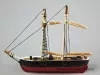 One small model of the American Navy topsail schooner, USS TIGRESS. The folk-art style model has a hand-carved wooden hull with thin wooden dowels used for the two masts as well as for the bowsprit, yard arms, and booms. Various deck structures and fittings are made of wood or metal. One small metal casting of a cannon is mounted on the deck. Black thread has been used for shrouds, stays, and other standing rigging. White thread has been used for running rigging. The masts, yard arms, bowsprit, and booms are finished with lacquer and white paint. The hull topsides (above the waterline) are painted black. The underside area of the hull (below the waterline) is painted red. The deck has been finished with a coat of lacquer. One small nail point protrudes from the lower starboard side of the hull for mounting on a wall.