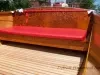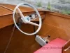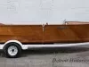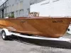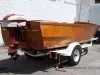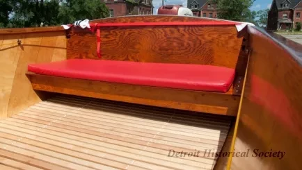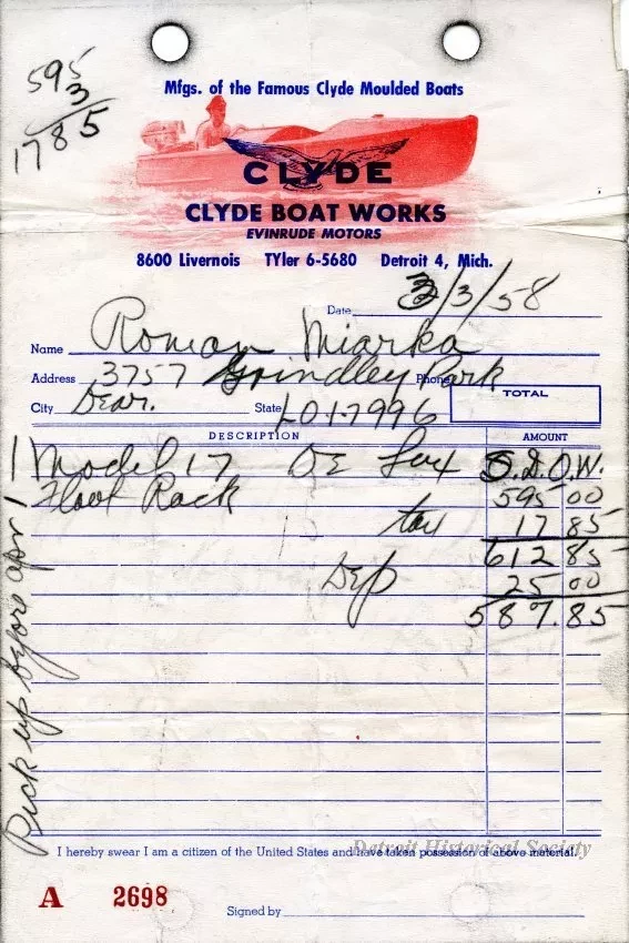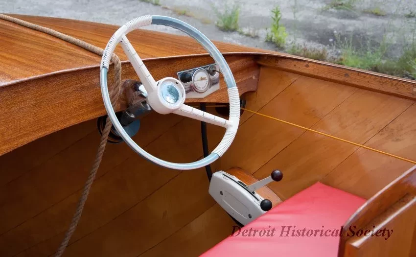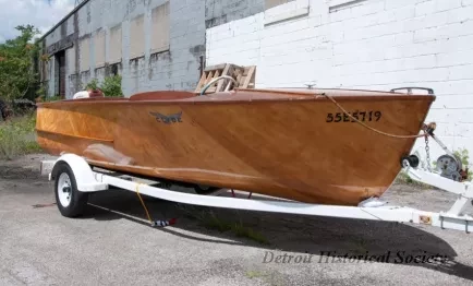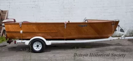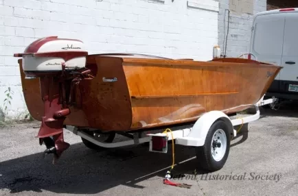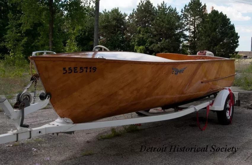 One outboard motorboat made by Clyde Boat Works of Detroit. The 17-foot long runabout was made of mahogany plywood. It has a small foredeck and an open cockpit in the back. One bench-type seat with a red vinyl seat cushion and backrest is located forward for the driver and a passenger. A steering wheel and controls are located on the starboard side. A second bench-type seat with a red vinyl seat cushion and backrest is located at the back of the cockpit just forward of the motor compartment. The cockpit floorboards are made of light-colored wood. The hull interior, exterior, and floorboards are all finished with a high-gloss marine spar varnish or polyurethane. A manufacturer's decal that reads "Clyde" in blue text with a blue/white image of a seagull is located on the exterior port and starboard sides of the hull in the area of the forward seat. A chrome-plated metal handle is located on the foredeck at the stem and also one on each side of the transom. The Canadian vessel license number, "55E5719," is shown in black lettering on each side of the hull at the bow. Boat accessories include a removable swim ladder, a small anchor with approximately 25 feet of 0.5-inch diameter manila rope, one wooden paddle, and a silver/gray nylon cover. The outboard motor and trailer are accessioned separately as 2018.106.002 and 2018.106.003, respectively.