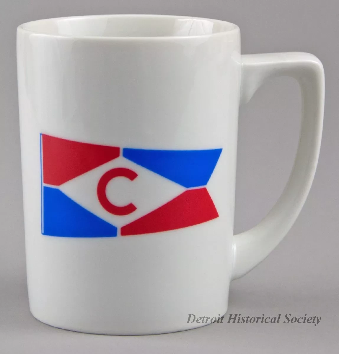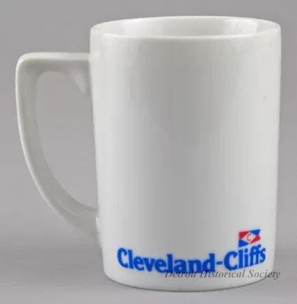 One coffee mug from the dining room of the SS EDWARD B. GREENE of the Cleveland-Cliffs Iron Company. The mug is made of white glazed china and is cylindrical in shape with sides that taper slightly to form a narrower bottom. It has a long, decorative handle with a thumb rest. The red/white/blue company flag is shown on one side of the mug and blue text on the opposite side reads "Cleveland-Cliffs." No manufacturer's name or marks are shown.