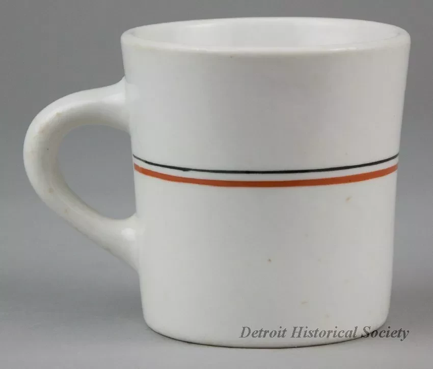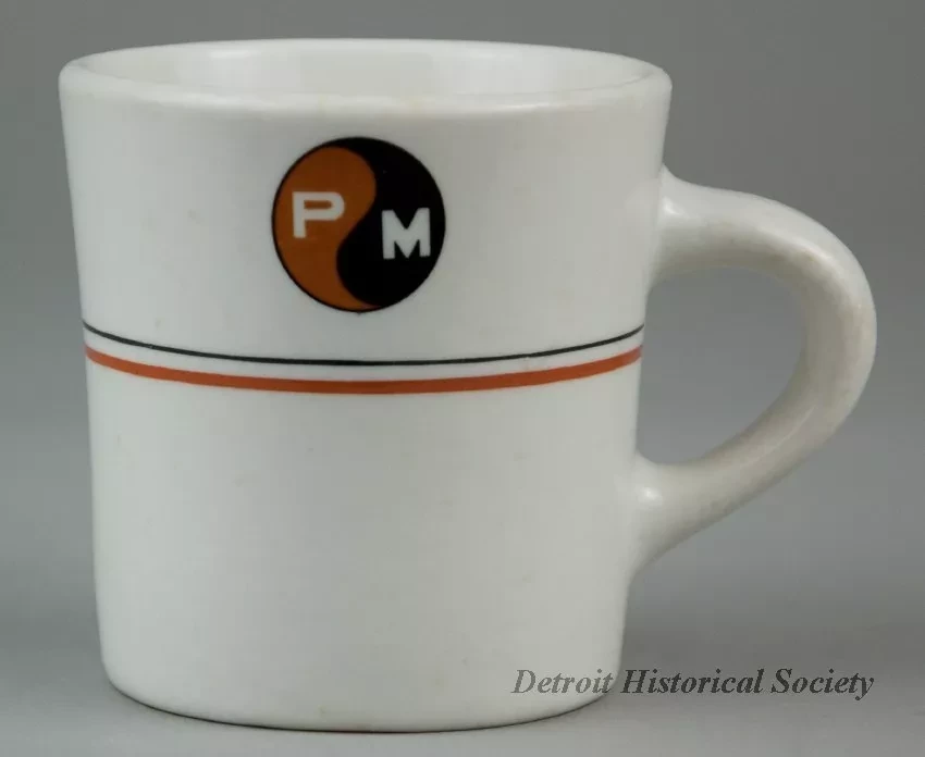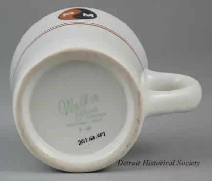 One coffee mug from a dining room of the Pickands Mather & Company steamship fleet. The mug is made of white glazed china. It is cylindrical in shape, has a rounded top edge, a plain round handle, and sides that taper slightly to form a narrower bottom. Narrow black and brown stripes encircle the cup just above the midpoint. The circular, black/brown "PM" company logo is stamped on the front of the mug above the stripes. The underside is stamped with black text that reads "Walker China, Vitrified," and "Bedford, Ohio, 1-46."