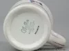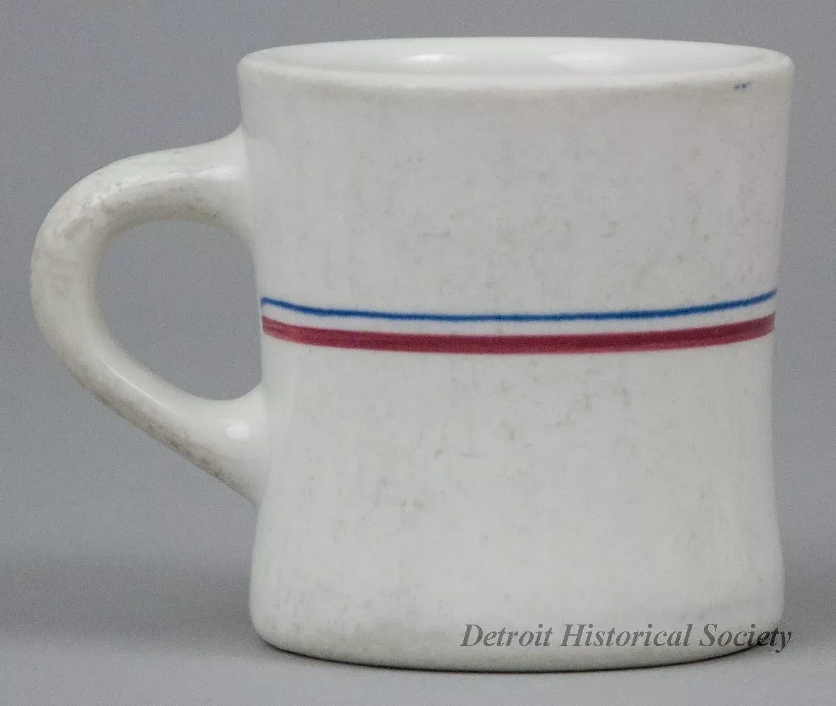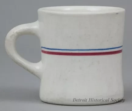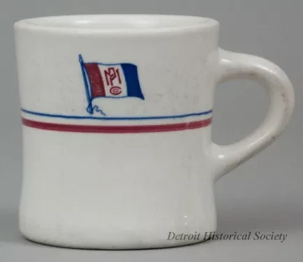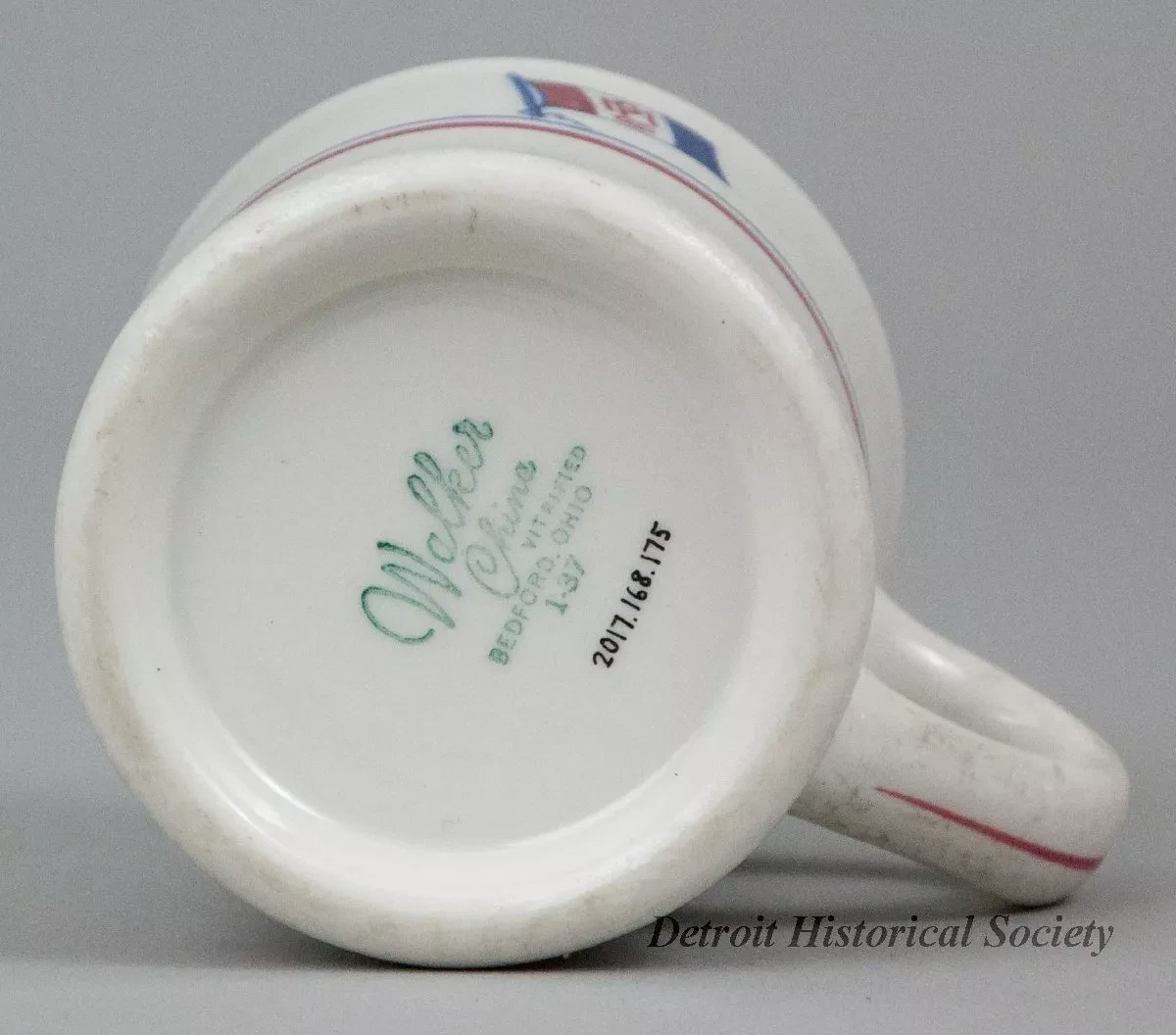 One coffee mug from a dining room of the Pickands Mather & Company steamship fleet. The mug is made of heavyweight white glazed china and is cylindrical in shape with a slight inward curve at the center. It has a rounded top edge, a plain round handle with a red stripe on the outside, and a rounded bottom edge. Narrow blue and red stripes encircle the cup just above the midpoint. A red/white/blue image of the "PM Co." company flag is stamped on the front of the mug above the stripes. The underside is stamped with black text that reads "Walker China, Vitrified," and "Bedford, Ohio, 1-37."