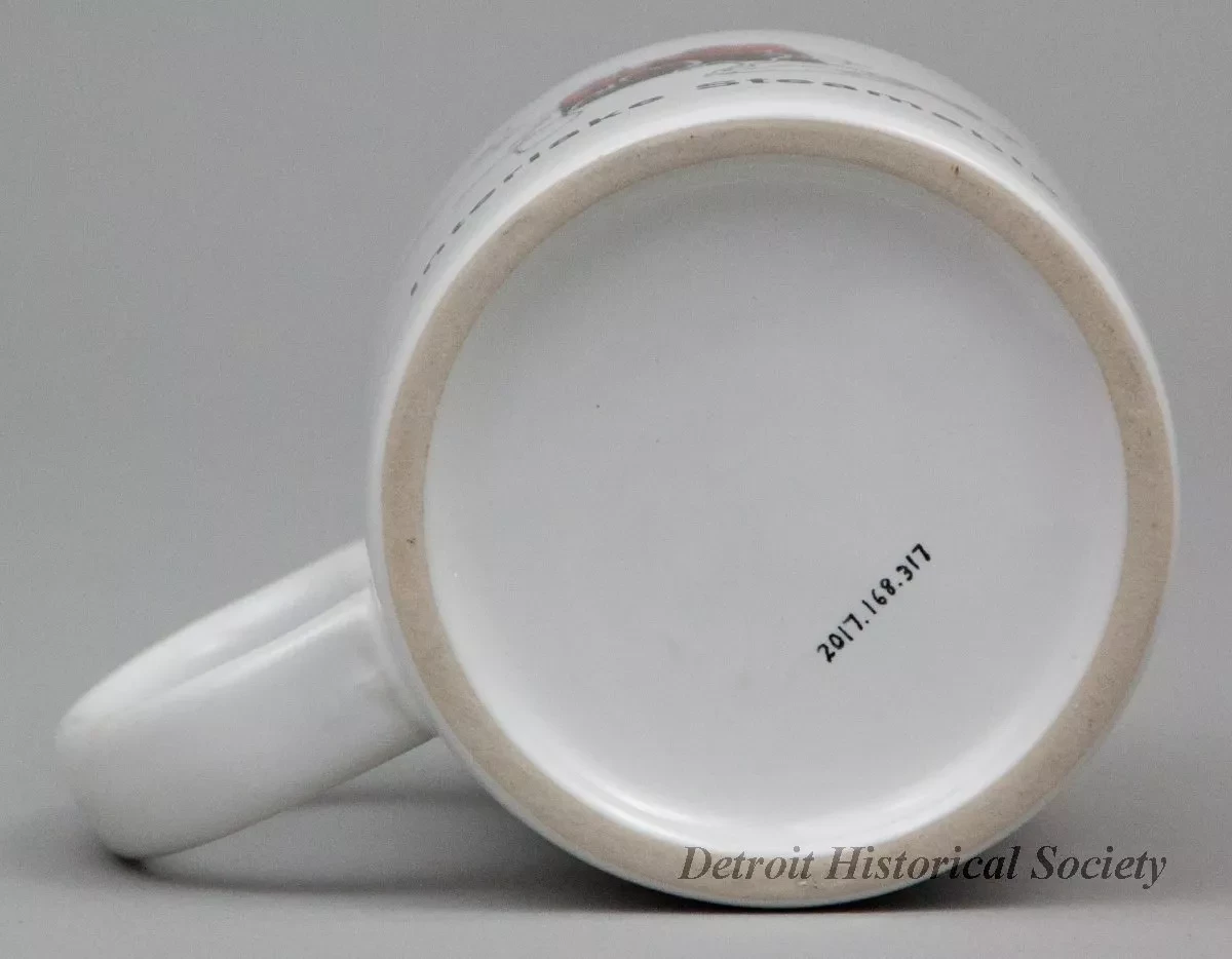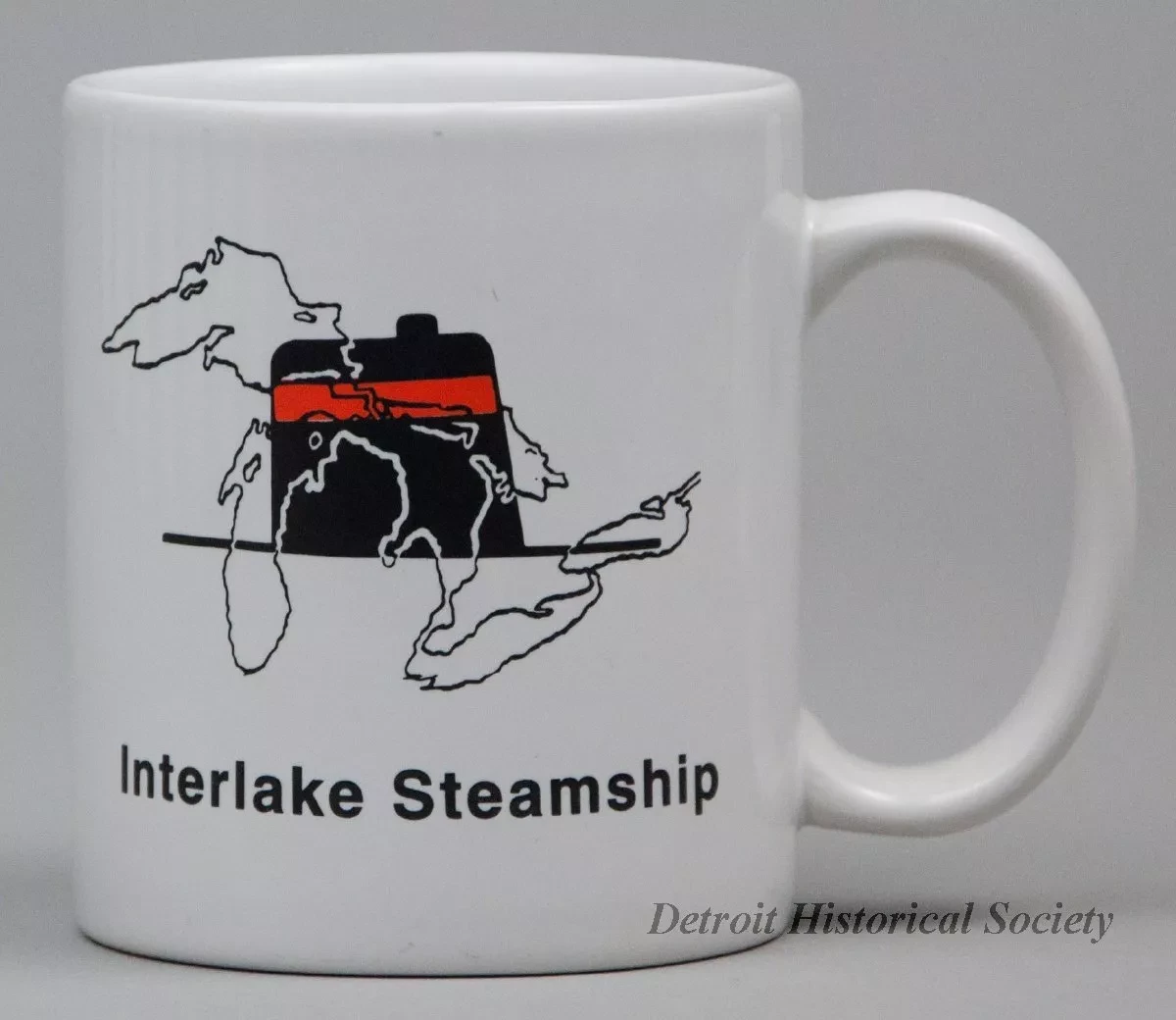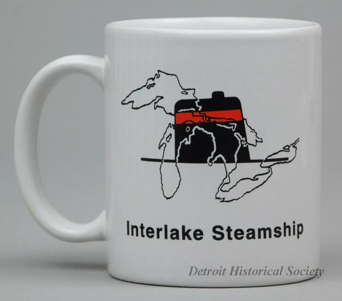 One souvenir coffee mug which features the Interlake Steamship Company. The mug is made of heavyweight white glazed china. It is cylindrical in shape with vertical sides, a rounded top edge, a flat bottom, and a tall oval-shaped handle on the side. On opposite sides of the mug, a black and white outline image of the Great Lakes is superimposed over a red/black image of the company smokestack. Black text beneath the image reads "Interlake Steamship." No manufacturer's name or marks are shown.