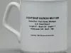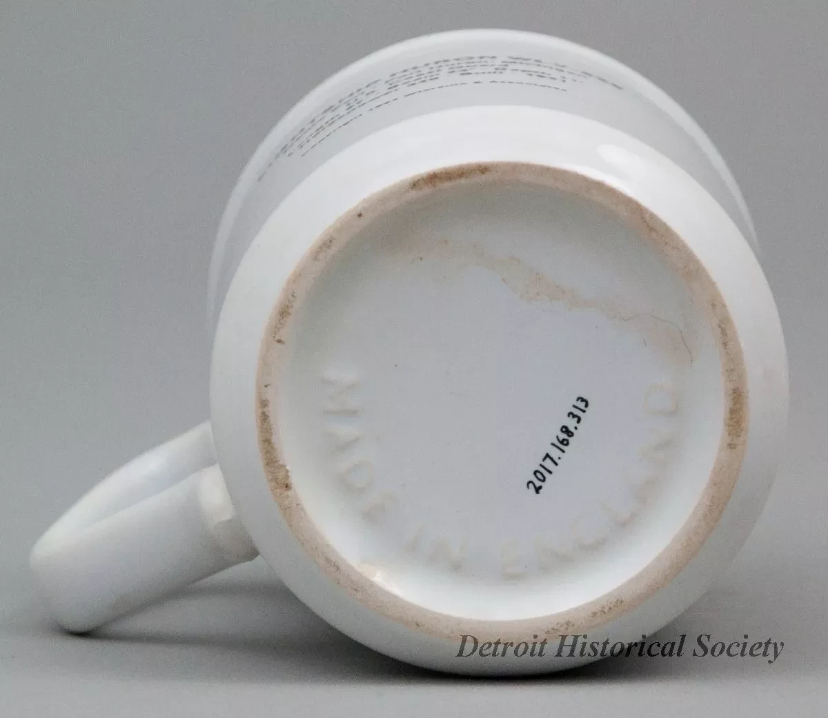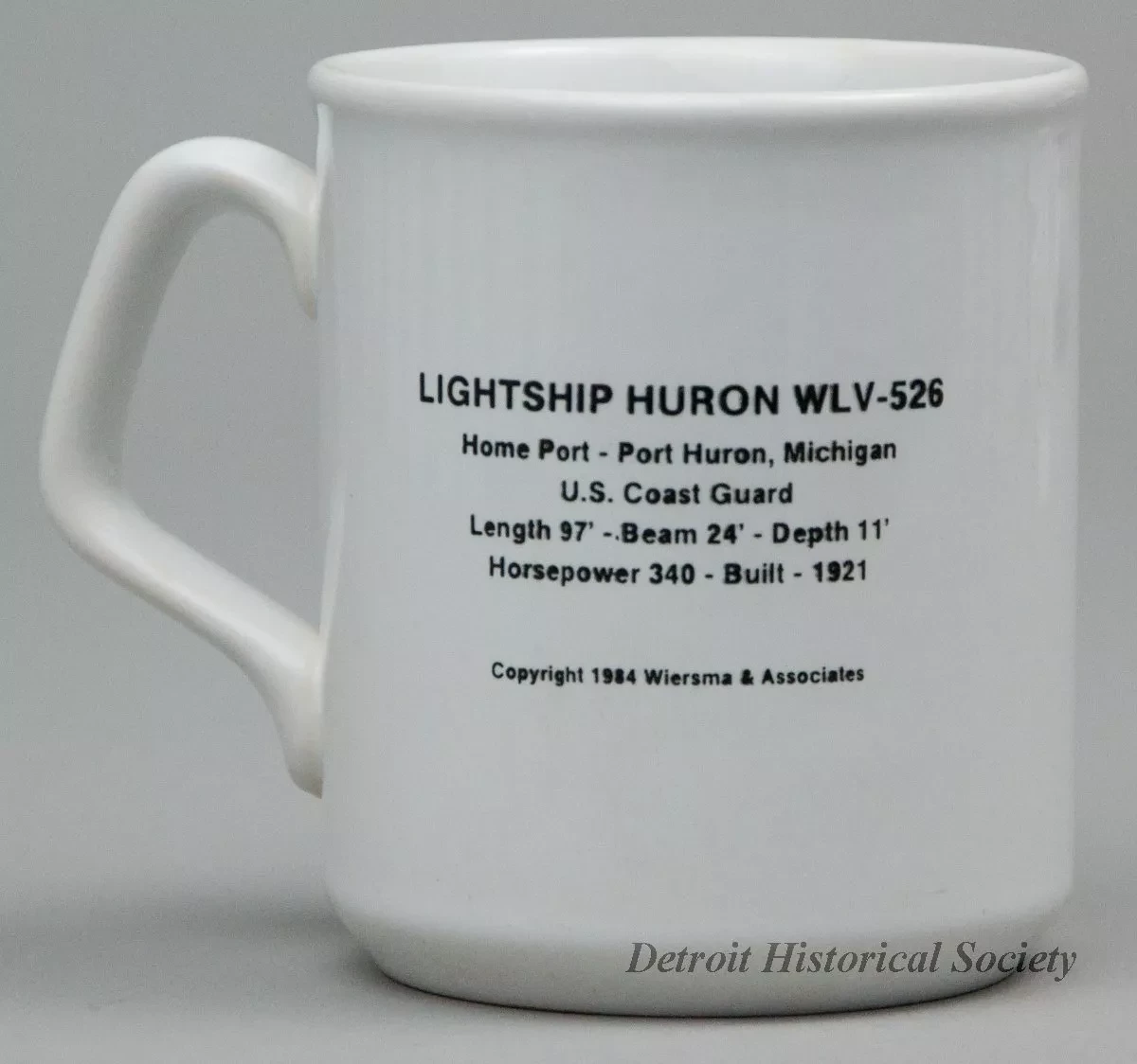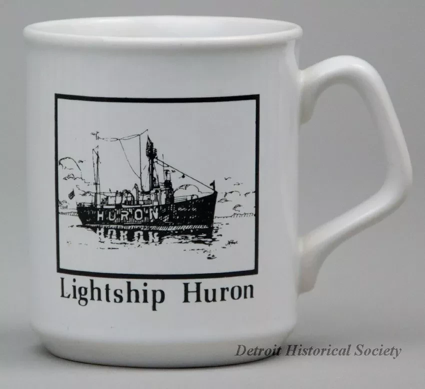 One souvenir coffee mug which features the lightship, Huron. The mug is made of heavyweight white glazed china. It is cylindrical in shape with vertical sides, a slightly flared top edge, a beveled bottom edge, and a stylized rectangular handle on the side. On one side of the mug, a black and white, square image is printed which shows a starboard side view of the lightship which is on station in calm waters. Black text beneath the image reads "Lightship Huron." Black printed text on the opposite side of the mug reads "Lightship Huron, WLV-526, Home Port - Port Huron, Michigan, U.S. Coast Guard, Length 97' - Beam 24' - Depth 11', Horsepower 340 - Built 1921," and "Copyright 1984 Wiersma & Associates." Raised text on the underside reads "Made in England."