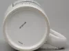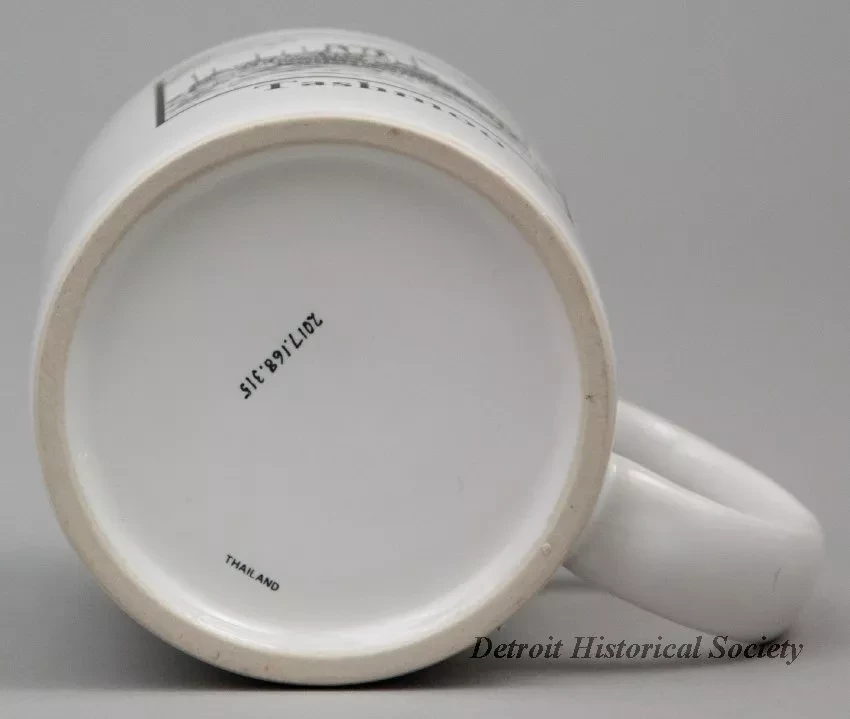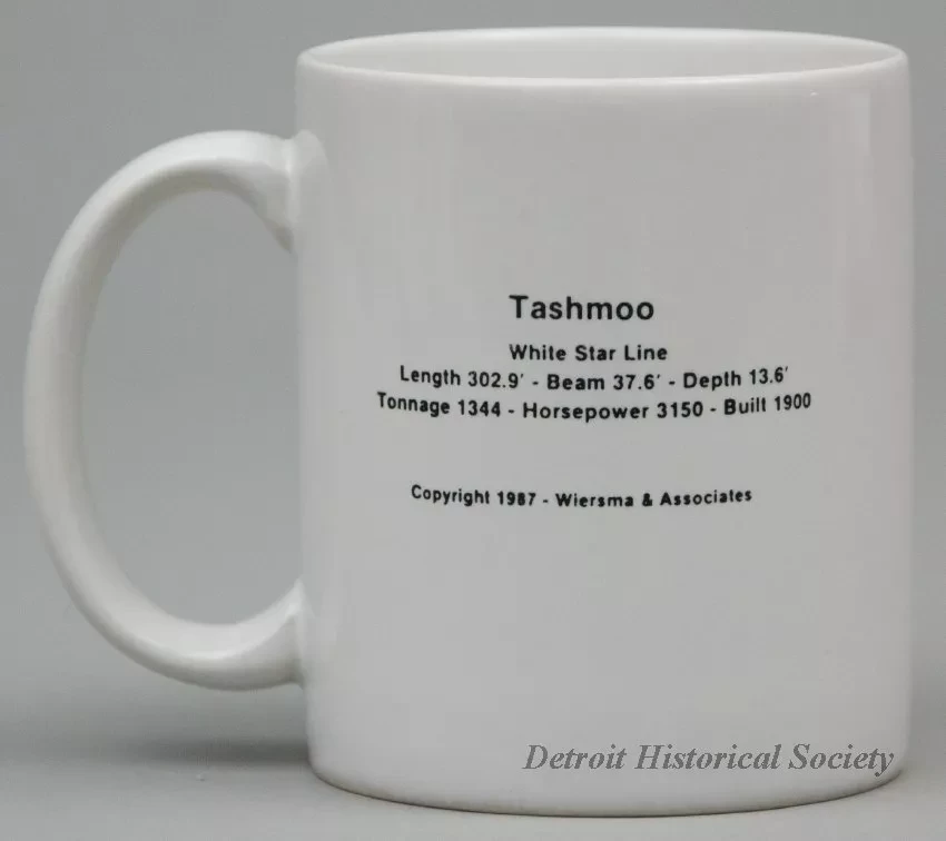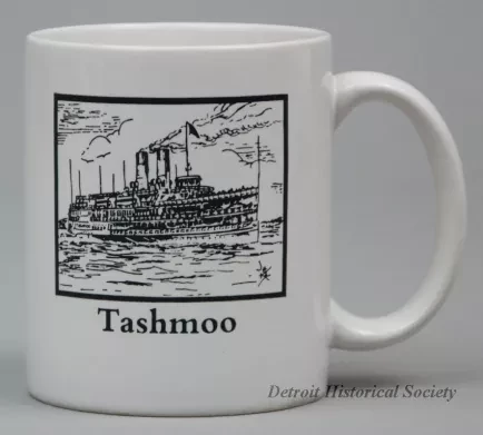 One souvenir coffee mug which features the passenger steamship, SS Tashmoo, of the White Star Line. The mug is made of heavyweight white glazed china. It is cylindrical in shape with vertical sides, a rounded top edge, a flat bottom, and a tall oval-shaped handle on the side. On one side of the mug, a black and white, square image is printed that shows a starboard side view of the sidewheel steamship which is underway in fair weather. Black text beneath the image reads "Tashmoo." Black printed text on the opposite side of the mug reads "Tashmoo, White Star Line, Length 302.9' - Beam 37.6' - Depth 13.6', Tonnage 1344 - Horsepower 3150 - Built 1900," and "Copyright 1987 Wiersma & Associates." Small black text on the underside reads "Thailand."