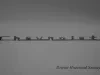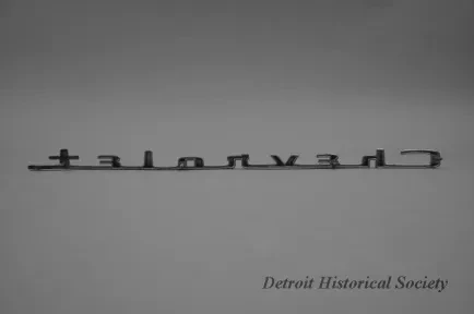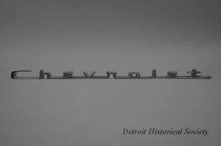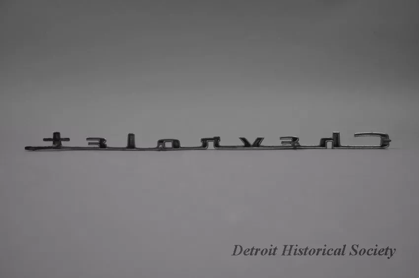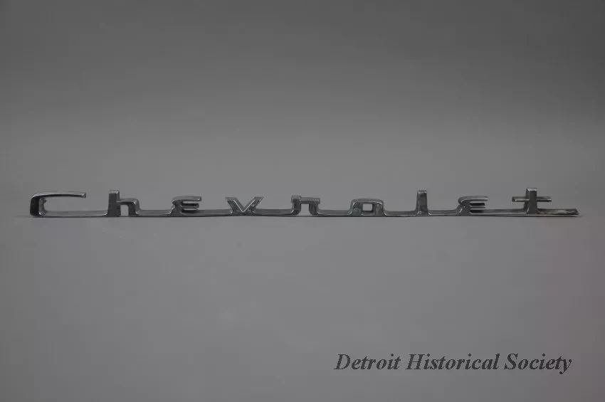 One automobile nameplate for "Chevrolet." The nameplate is made of chrome-plated metal and shows lettering in raised script text. It has four short metal pegs on the back for attachment to a vehicle.