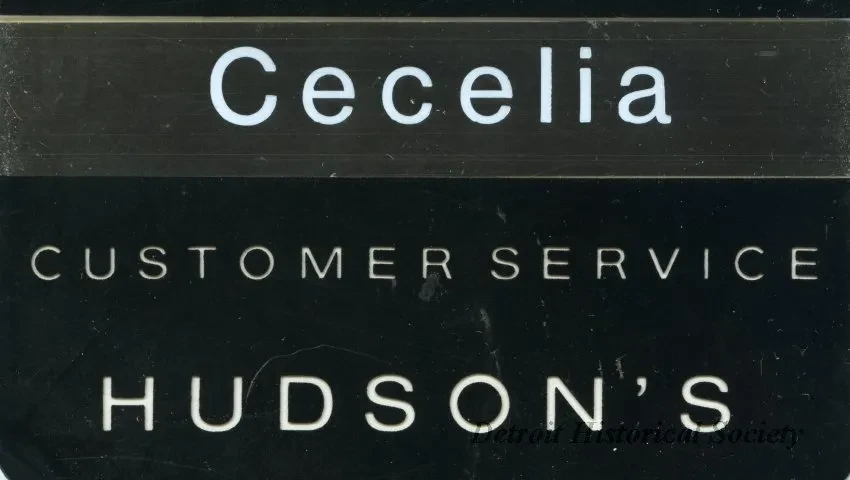 One nametag for "Cecelia" of "Customer Service, Hudson's." The rectangular plastic nametag has a black front with white lettering. The back is white and has a metal clasp pin with a clear plastic adhesive mounting.