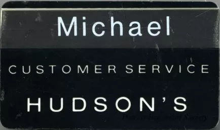 One nametag for "Michael" of "Customer Service, Hudson's." The rectangular plastic nametag has a black front with white lettering. The back is white and has a metal clasp pin with a clear plastic adhesive mounting.
