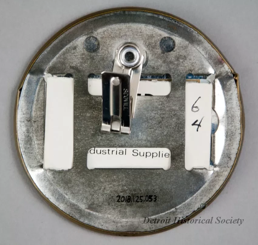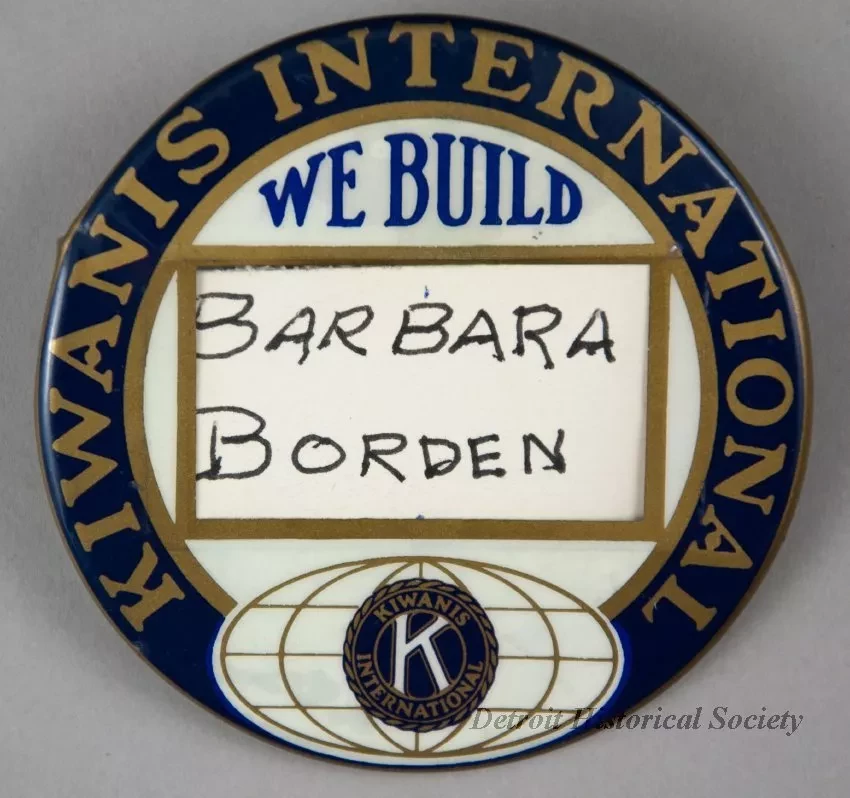 One Detroit Kiwanis Club No. 1 nametag for "Barbara Borden." The circular, button-style nametag has a printed paper front with a rectangular window for a paper insert which shows the name in handwritten black text. The nametag shows the Kiwanis logo at the bottom, and has a blue border with gold-colored text that reads "Kiwanis International." The paper front is mounted on a thin steel backing plate that has a spring clip.