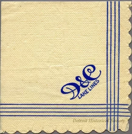 One cocktail napkin from a D&C Lakes Lines steamship. The folded napkin is made of pale yellow paper that has a faint stippled texture. Two adjoining edges have a decorative scalloped cut with four narrow parallel blue lines printed above the cut edges. "D&C Lakes Lines" is printed in blue text near the corner where the blue lines intersect.