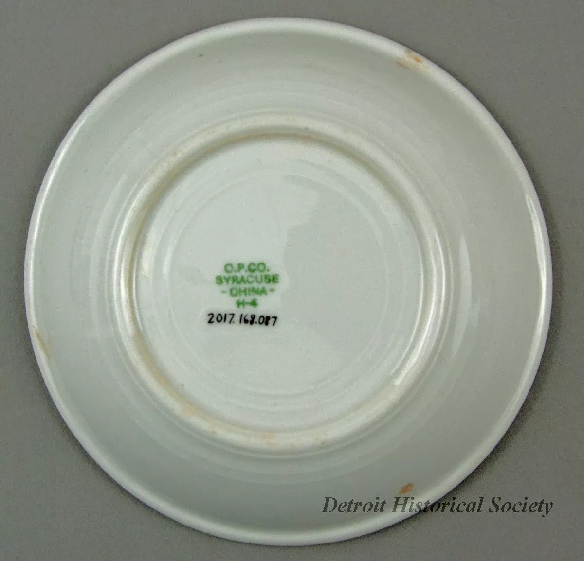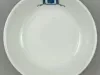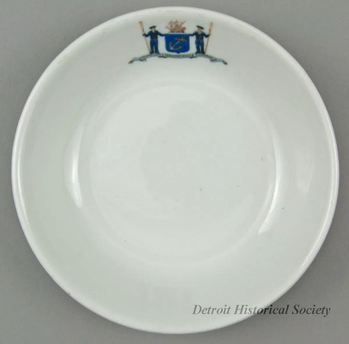 One small fruit nappy bowl from the dining room of the passenger steamship, SS Vermont, of the Lake Champlain Transportation Company. The round bowl is made of heavyweight, white glazed china. It has a rounded rim with a thickened outer edge, sloped sides that have a slight curve, a flat bottom, and a circular base. A decorative multicolor company emblem is stamped on the top surface of the bowl at the side. Small text along the bottom of the emblem reads "Champlain Transportation Company." The underside is stamped with black text that reads "O.P. Co., Syracuse China," and "H-4."