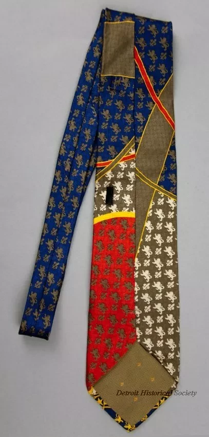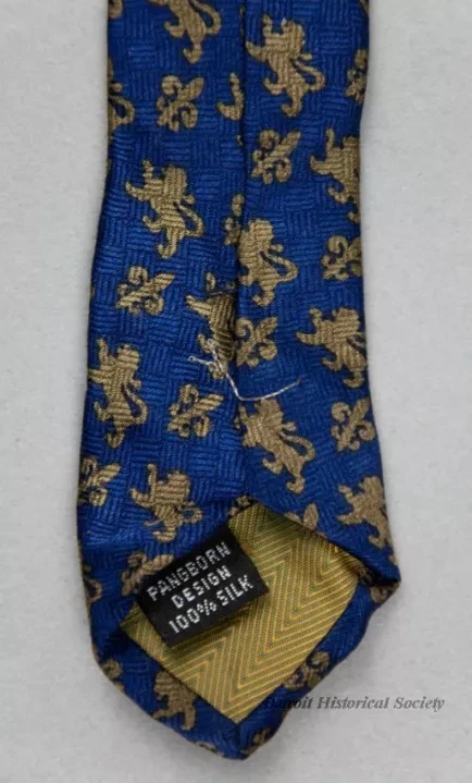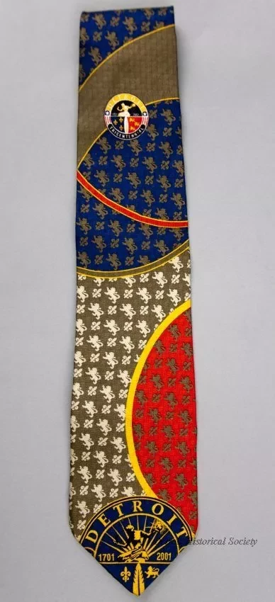 One man's necktie from the Detroit Tricentennial celebration. The necktie is made of silk that has been printed with a multi-color pattern of small lions and fleur-de-lis. The upper center area of the tie shows the Tricentennial logo and the bottom shows an enlarge detail of a portion of the logo in a blue/gold print. A small black label on the back of the tie at the narrow end has white text that reads "Pangborn Design, 100% Silk."