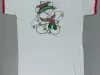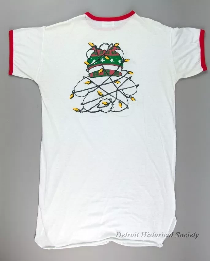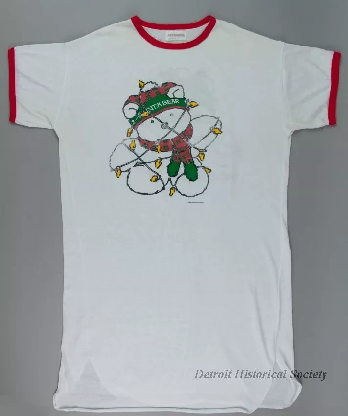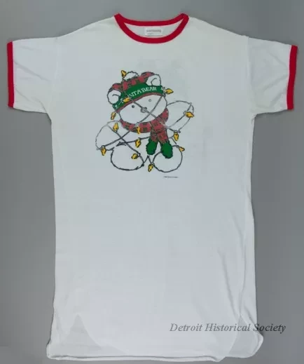 One Santa Bear nightshirt which was sold as a promotional item by the Dayton Hudson Company as part of their 1986 Christmas holiday marketing campaign. The knee-length nightshirt has a round collar, short sleeves, and is made of lightweight white cotton fabric. It has 3/4-inch wide red knit bands around the collar and the ends of the sleeves. The lower edge has a plain rolled hem. A multi-color Santabear image is printed on the upper center front and back sides of the nightshirt. A fabric label on the inside back collar reads "Santabear."