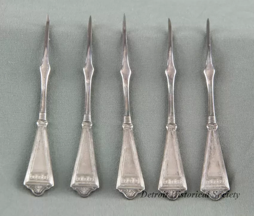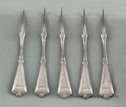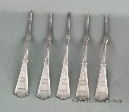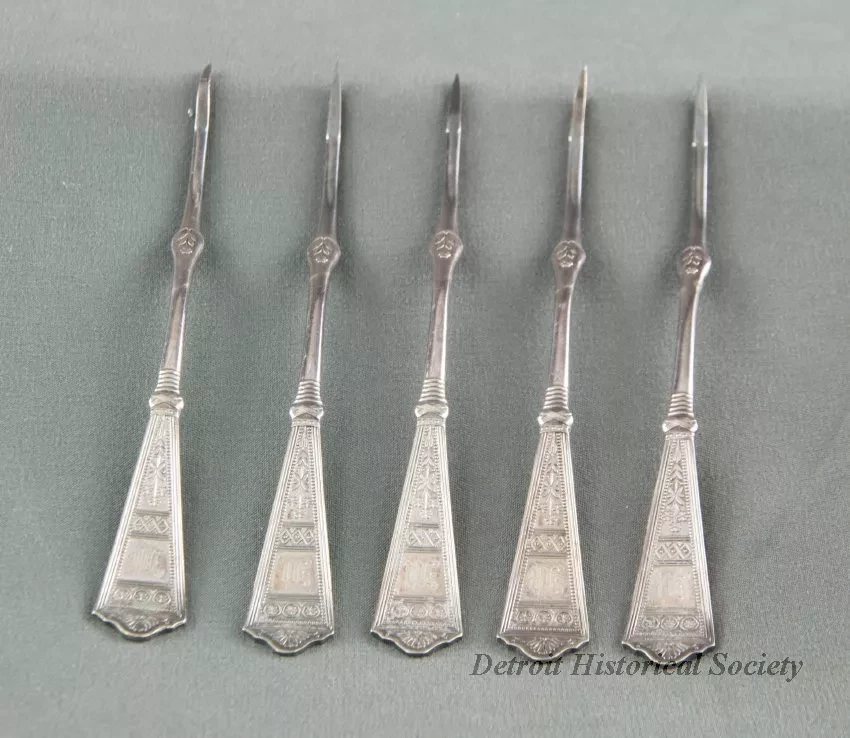 One set of five sterling silver nutpicks. Each has a symmetrical design of flowers and leaves, lines, and circles. Each is monogrammed with "M." No manufacturer's mark.