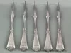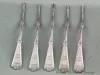 Request ImageOne set of five sterling silver nutpicks. Each has a symmetrical design of flowers and leaves, lines, and circles. Each is monogrammed with "M." No manufacturer's mark.