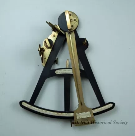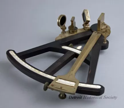One octant. The octant has an ebony wood body with brass mechanical parts. It has a peep sight and an adjustable horizon mirror. The graduated arc on the bottom of the sextant is marked from 0 to 105 degrees and includes an adjustable 0 to 20 vernier scale which allows the angle to be read to the nearest minute. The graduated arc scale and vernier scale are both made of ivory. The sextant includes three glass index filters (one green and two red) at the top of the frame and two glass horizon filters (one green and one red) near the middle. All of the filters can be rotated in or out of the line of sight depending upon the sunlight intensity when sights were being taken. The frame arc is marked: "Spencer, Browning & Co., London," and "Made for D. McGregor, Greenock & Glasgow." Script letters, "SBR [Spencer, Browning, Rust]," are shown at the center of the graduated arc.