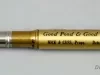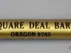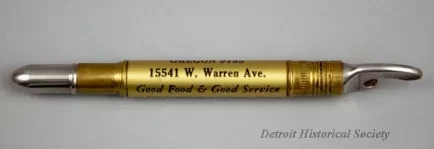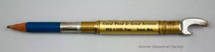 One combination tool consisting of a bottle opener and pencil holder from the "Square Deal Bar." The tubular, metal, pocket-size tool has a small bottle opener at one end and a hidden pencil that slides out from the opposite end. The center part of the tool is gold-colored and has black printed text that reads "Square Deal Bar, Oregon 9785, 15541 W. Warren Ave.," and "Good Food & Good Service, Nick & Guss, Props., Detroit, Mich."